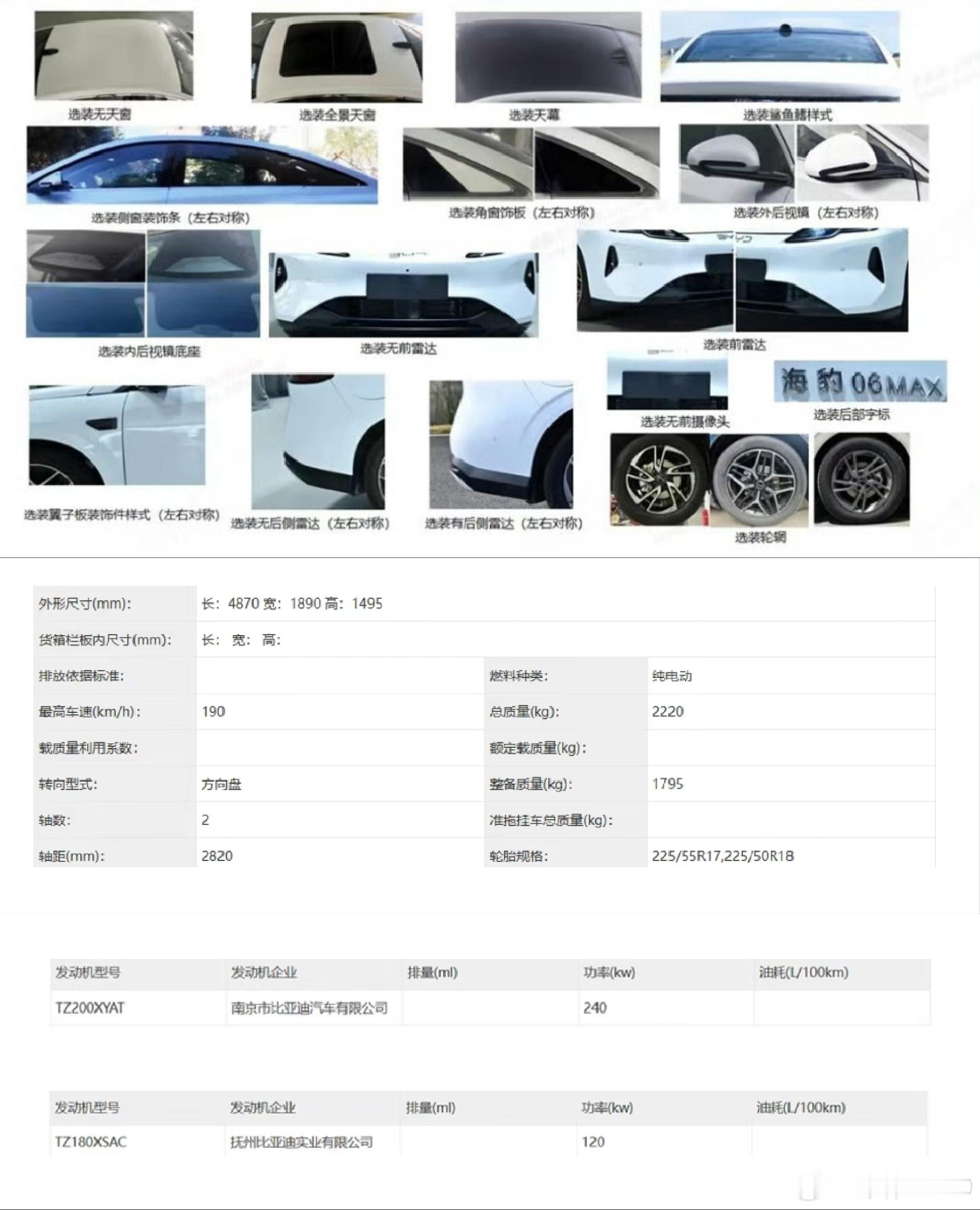海豹06 EV 最新申报!尺寸4870/1890/1495毫米,轴距2820毫米。相比现款 前脸优化更耐看,选装全景天幕及MAX尾标,动力续航提升