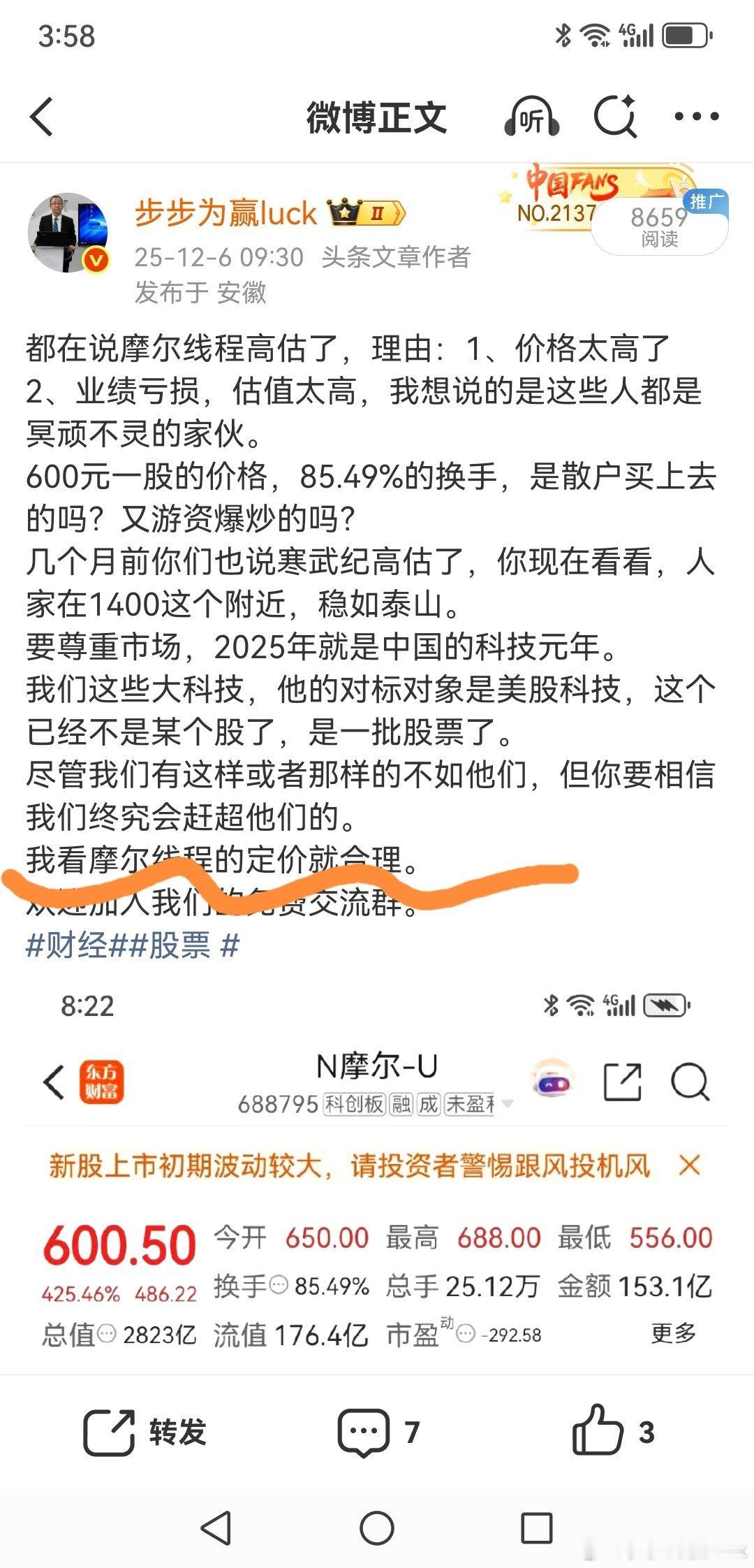 摩尔线程,今怒涨十八个点,事实证明我们对于摩尔线程的观点是正确的。今天虽然很多大科技品种出现了下跌,但不要有任何负面情绪,大资金根本没有撤离的想法。头部大科技每一次的下跌都是你上车的机会,不要谋求一次准确和短线。财经股票