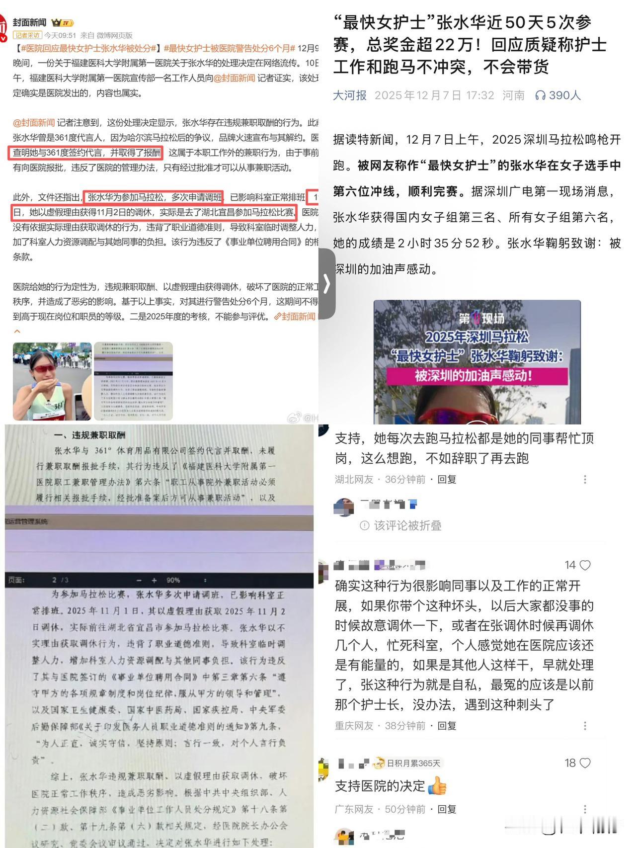在马拉松希望领导给调休的女护士被医院处分了。 张水华是福建医科大学附属第一医院的护士,被称为“最快女护士”。2025年8月底,她在哈尔滨马拉松比赛夺冠后,接受采访时哭诉希望单位领导支持其调休参加比赛,引发了舆论风波。 她多次在马拉松比赛中取得优异成绩。2025年2月7日,她在深圳马拉松获得国内女子组第三名、所有女子组第六名,奖金6000美元。有报道称其“50天参加5场马拉松,奖金超22万元”。感觉她这个收入和目前状态完全可以全职跑马拉松呀。 根据医院内部通报文件,张水华主要存在两项违规行为。首先,她与361°体育用品有限公司签约其次,为参加马拉松比赛,她多次申请调班,已影响科室正常排班。医院认为这些行为违背了职业道德准则,导致科室临时调整人力,增加同事负担。 医院内部通报重点: 首先张水华存在违规兼职取酬的行为。(代言并取酬,但未履行兼职取酬报批手续)违反了《福建医科大学附属第一医院职工兼职管理办法》。 其次张水华为参加马拉松,多次申请调班,已影响科室正常排班。 (2025年11月1日,她以虚假理由获取11月2日的调休,实际前往湖北省宜昌市参加马拉松比赛)。 处分6个月,期间不得聘用到高于现聘岗位和职员等级。 这个处罚的核心不是“爱好与职业”的对立,而是规则底线的失守。作为事业单位工作人员,兼职代言未按规定报批、以虚假理由调休影响医疗排班,跑马拉松很挣钱,她代言一次也价格不菲。有网友认为事业单位的编制占着,马拉松要跑着,还有代言费,一石三鸟。
