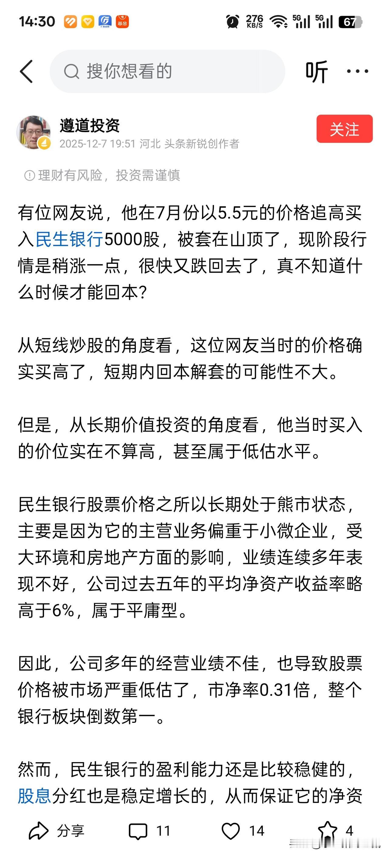 安慰人是善举,但在股市未必! 看到有位朋友发帖,安慰有位在5.5元买入民生银行的网友,并告知ta这个价格短期可能高了,但是从价值投资和长期投资角度来看,价格不贵甚至低估。 不得不说,安慰别人是善举,但是涉及到资本市场的真金白银投资,泛泛的安慰也就算了,但是如果涉及价格、收益等的具体安慰,建议还是量力而行,具备了能力再去安慰别人! 在我看来,5.5元对现在的民生来说,几乎是非常高估的价格了,即使回到所谓的”长期“,虽然不知道原文说的长期有多少长,但是我觉得3-5年内,5.5元依然是民生银行一个非常夸张离谱的”高价“了。至于为什么,我曾经多次说过民生,有兴趣可以去翻翻。 要是换了我啊,一定这么安慰ta:还好,才亏了不到30%,抓紧抛售离开烂公司,在牛市上认清好公司,把30%拿回来的机会在等着你!