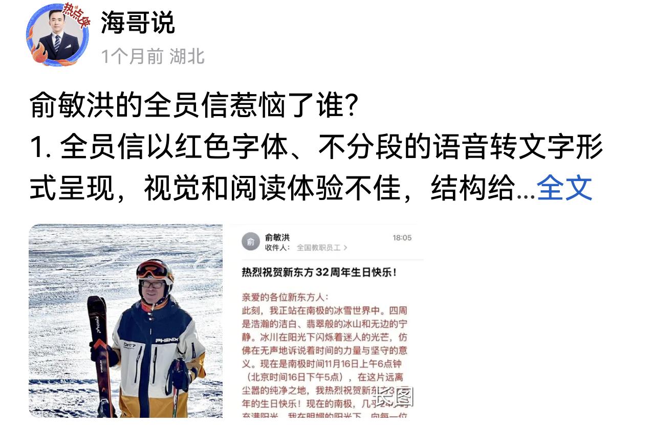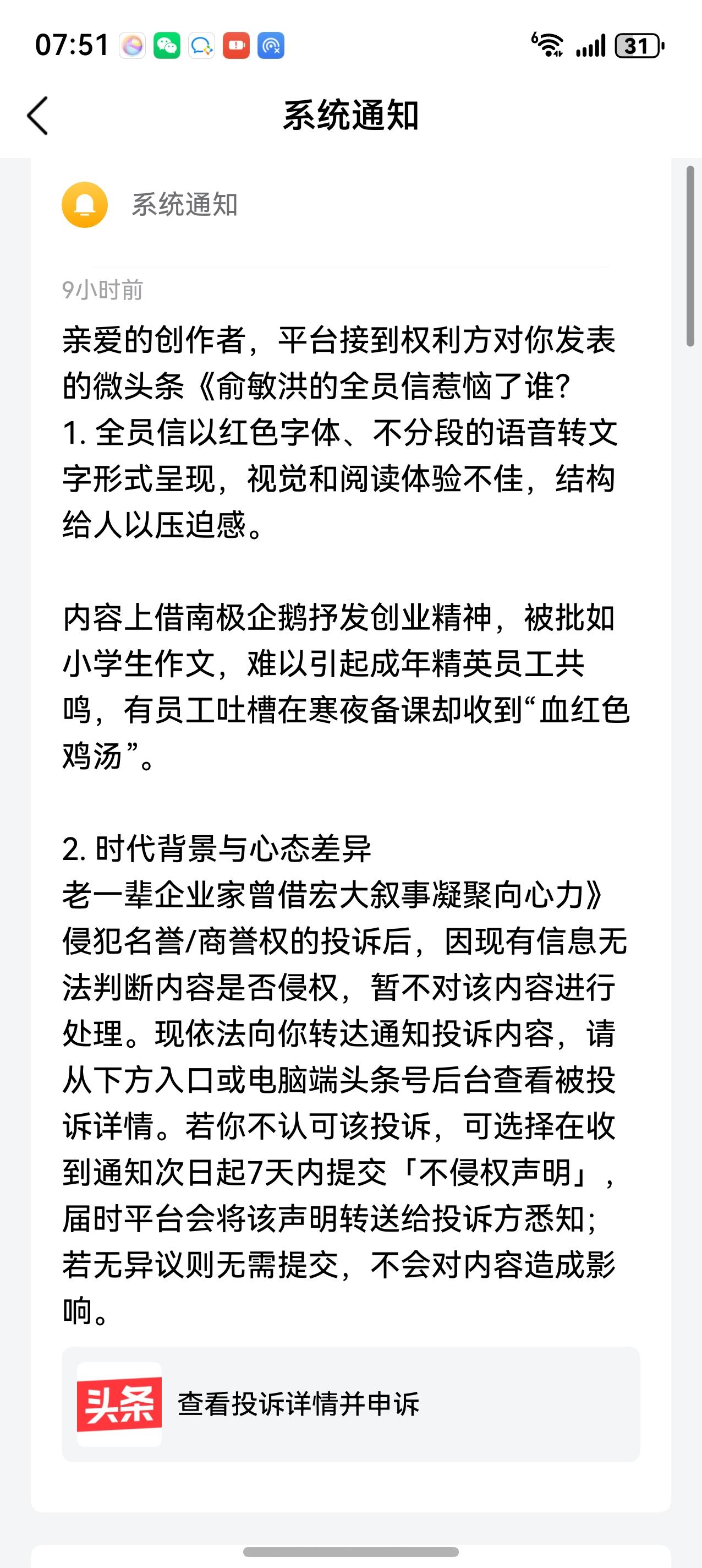 我的微头条被告了。《俞敏洪的全员信惹恼了谁?》刚被投诉侵犯名誉权了。虽然内容还在,但这事本身就很说明问题——现在的职场沟通,真的是一步一个雷区啊!💣 回看这场风波,有三个问题值得所有管理者警惕: 🚩 形式大于内容,注定翻车 大红字刷屏、语音转文字还不分段……这种“爹味十足”的格式,年轻员工一看就头皮发麻。当老板在南极感慨“企鹅精神”时,员工可能正在出租屋里熬夜改PPT。理想很丰满,现实很骨感。 🚩 60后老板和90后员工活在两个世界 老一辈企业家喜欢谈情怀、讲奋斗,但年轻人更关心:加班费什么时候发?年假能不能休?代际认知差异在这件事上体现得淋漓尽致。 🚩 企业文化不是单向灌输,而是双向奔赴 值得点赞的是,新东方事后不仅允许员工公开吐槽,还承诺调查加班问题。这种开放姿态,恰恰是现代企业最需要的进化。 这场风波的启示其实很简单:别用你爹妈教育你的方式,去管理现在的年轻人。真正的企业文化,不是写在南极冰川上的豪言壮语,而是体现在每个员工下班时,是真的回家还是继续回工作微信群。 还有,我只是头条上的一名普通头条客,有感而发的小段文字,竟然被以侵犯名誉权投诉;我了个去,是你把我当根葱呢?还是你把自己当根葱了呢? 俞敏洪 职场那些事儿 管理思维 代际沟通 (声明:本文仅探讨现象,无意针对任何个人或企业)
