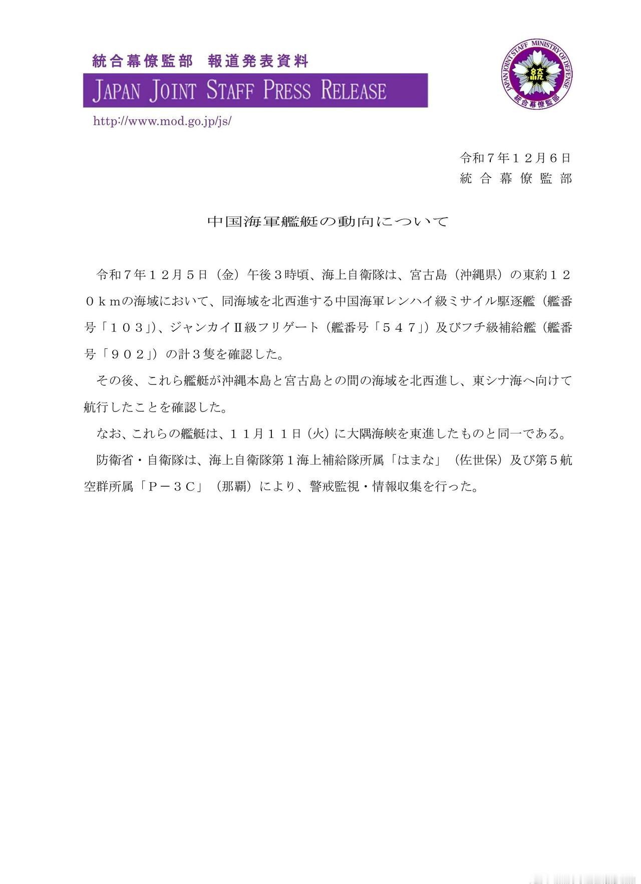 日本防卫省发布消息,12月5日,中国海军辽宁舰航母编队穿航宫古海峡,从东海进入琉球东南海域的太平洋活动。 当天,中国海军055型万吨大驱鞍山舰编队在穿航大隅海峡后,经宫古海峡返回东海,完成远海训练任务。