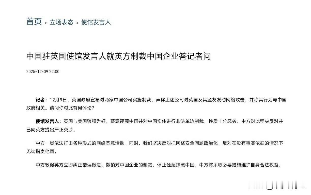 英国与美国狼狈为奸蓄意诬蔑中国 中国驻英国使馆发言人就英方制裁中国企业答记者问:英国与美国狼狈为奸,蓄意诬蔑中国并对中国实体进行非法单边制裁,性质十分恶劣。中方对此坚决反对并已向英方提出严正交涉。