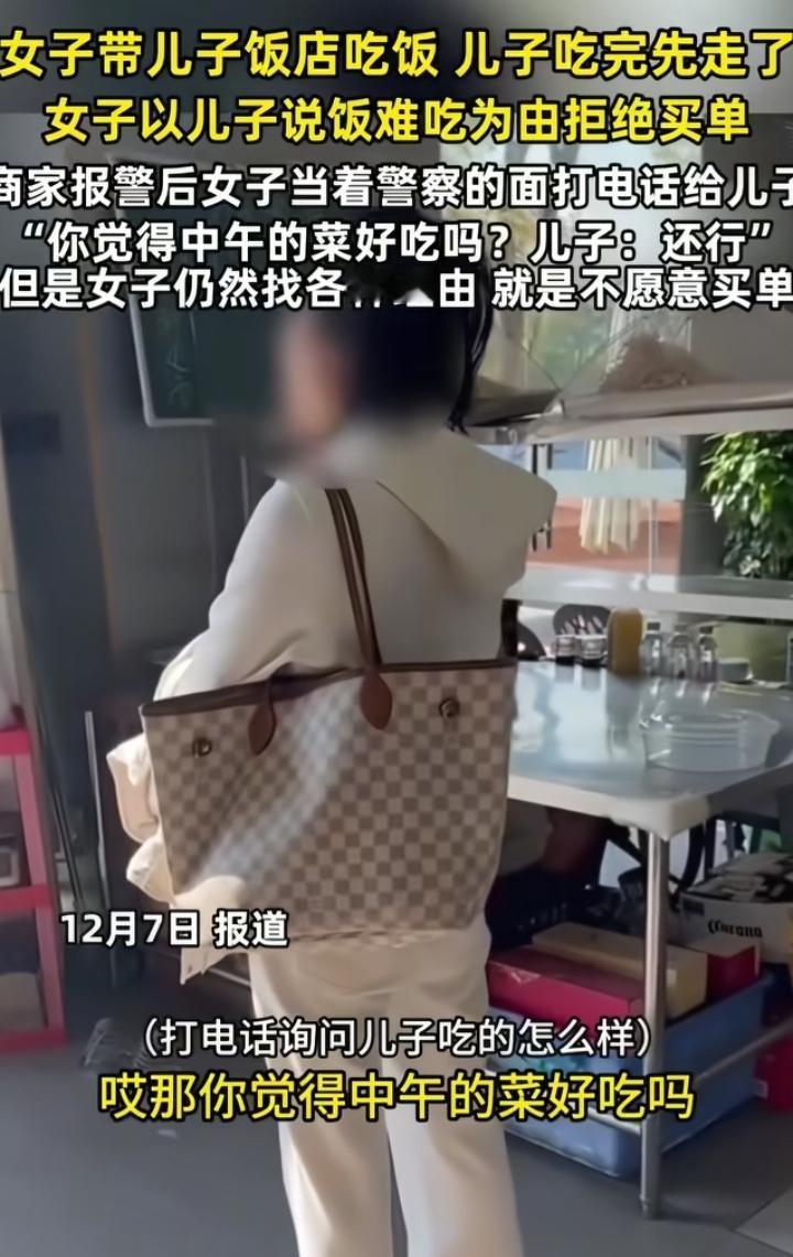 一位母亲想吃霸王餐,让儿子先跑,看她接下来的操作。 12月6日,一名女子带着儿子到饭店吃饭,饭菜端上来以后,儿子狂吃一通,吃饱了人先撤了,然后女子开始耍赖。 女子跟店家讲:“你家菜太难吃,我儿子嫌弃难吃走掉了,凭什么给你钱”? 店家报警以后,女子想当着警察的面证明饭菜难吃,于是给儿子拨打电话,问儿子菜好不好吃,结果她儿子说:“还行”。 店家也很无语,气愤道:“没钱你吃什么饭”? 女子亮出微信余额,称:“我有钱,看到了吗?800多块”。 店家:“有钱你干嘛不给,你儿子一开始吃的挺多的”。 女子:“那是我逼他吃的,你让服务员给我打包,我要拿到市场管理局去”。 店家:“想打包你要付账啊”! 霸王餐能吃到这种地步,也真是长见识了,明明吃的比谁都香,结果吃完不认账,不仅不认账,还想打包带走回家吃。让儿子背刺了也不脸红,语气那叫一个硬气。 嫌弃难吃要干嘛去了?店家早就看穿了一切,不给钱就别想出门,这种家长能教育出什么样的孩子?