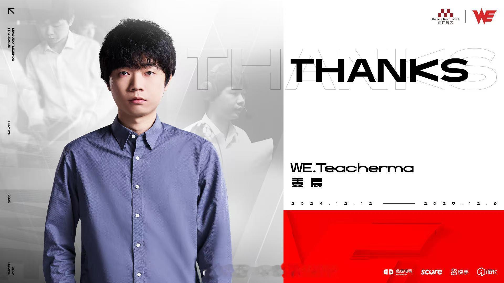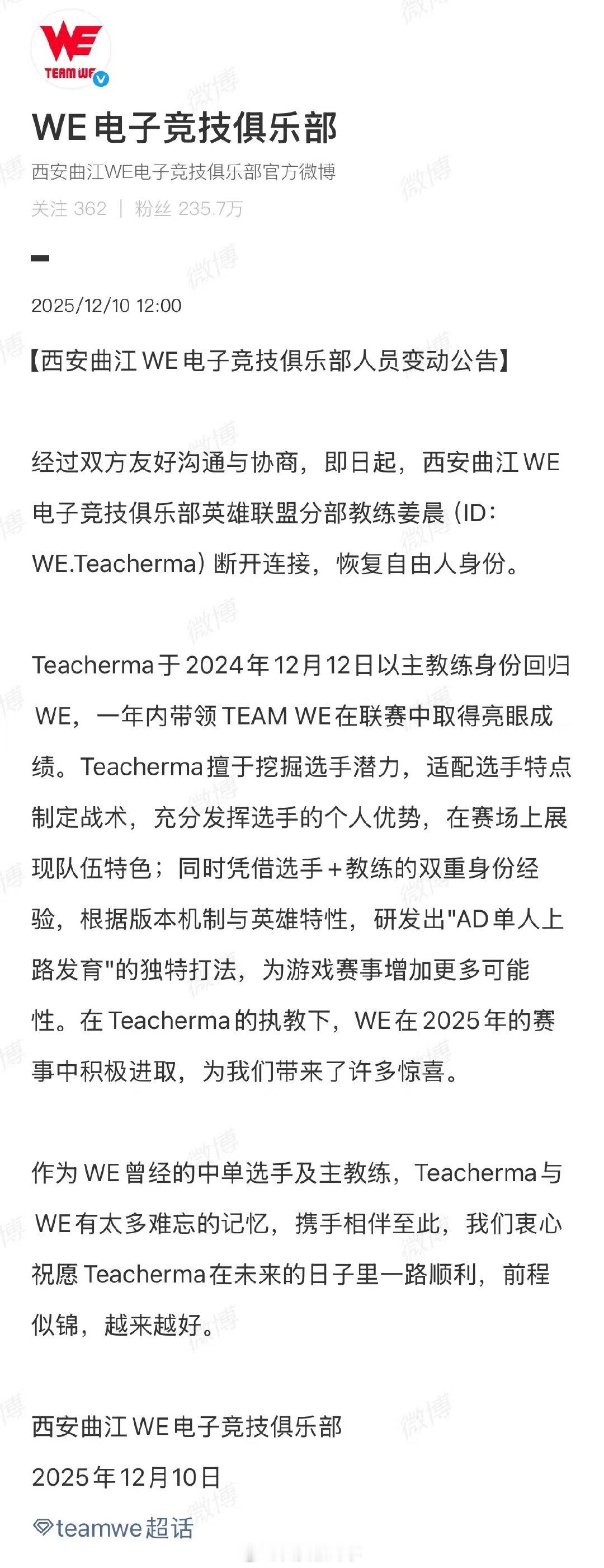 【WE官宣Teacherma恢复自由人】WE官宣教练姜晨恢复自由人12月10日,西安曲江WE电子竞技俱乐部人员变动公告:经过双方友好沟通与协商,即日起,西安曲江WE电子竞技俱乐部英雄联盟分部教练姜晨(ID:WE.Teacherma)断开连接,恢复自由人身份。作为WE曾经的中单选手及主教练,Teacherma与WE有太多难忘的记忆,携手相伴至此,我们衷心祝愿Teacherma在未来的日子里一路顺利,前程似锦,越来越好。
