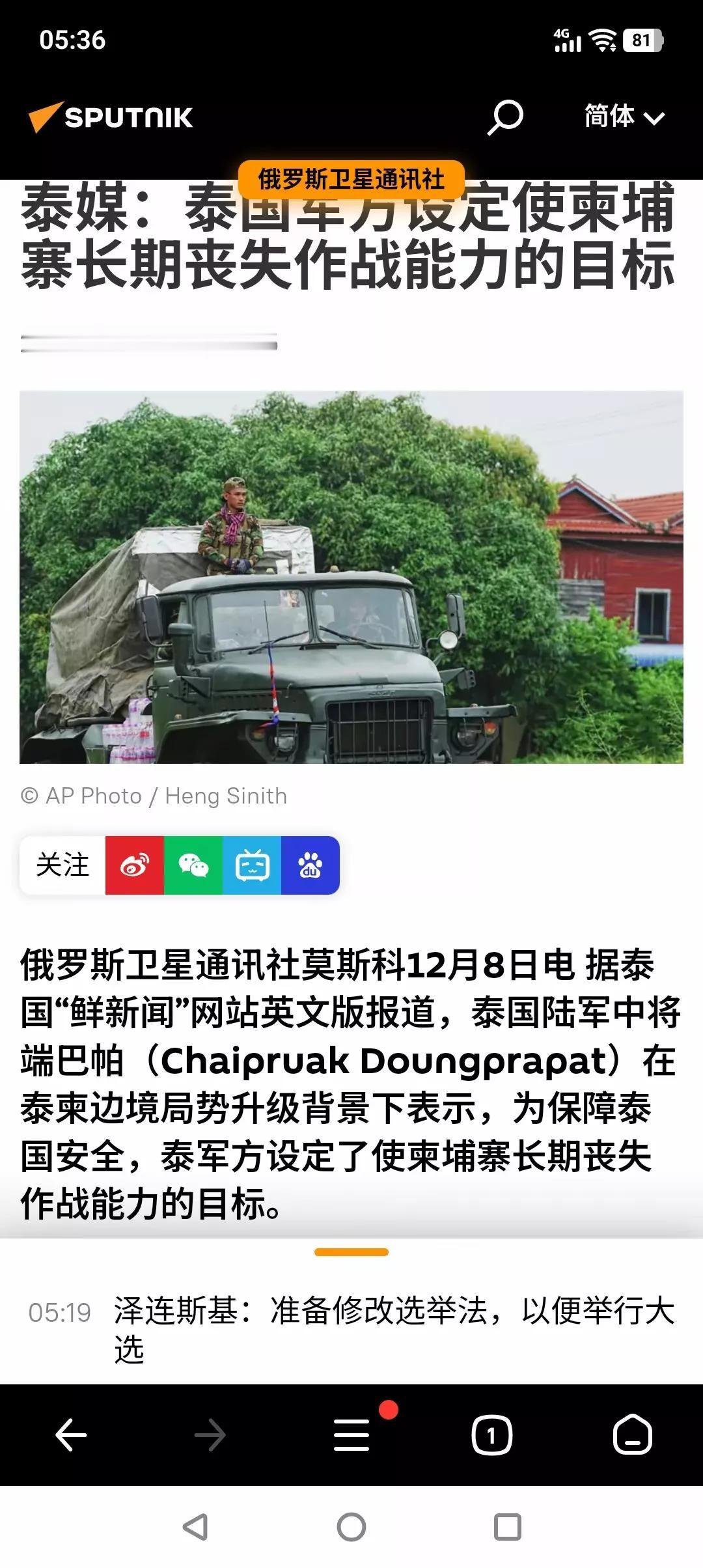 泰国肯定会把柬埔寨往死里打,这个大家没必要怀疑。 一是泰国总理阿努廷支持率低,他的党在议会只是第三大党。他的上位只是一时找不到合适的人选,然后妥协的结果。 作为"跛脚"总理,他一定要搞点事,提高议会向心力,否则他这个总理也当不久就会下台。 那么怎么办?把柬埔寨揍一顿,既能转移国内矛盾,又能增加国民凝聚力。这个时候,议会也就没人好意思把他赶下台了。 二是他信家族在泰国势力极大。他信不可能放过自己的仇人洪森。何努廷此时向柬埔寨开战,也有讨好他信家族,稳定自己内阁的目的。 另外,美国目前自己麻烦事多,比如俄乌问题、委内瑞拉问题,亚洲两个小国的事它还真顾不上。 以前东盟的事一般是印尼出头,但泰国是东盟第二大经济体,对印尼一向不大服气。 除非东大出面,但、但…谁让你搞电诈呢? (图:泰媒说要瓦解柬埔寨的军事作战能力,让它没机会再发动战争。)