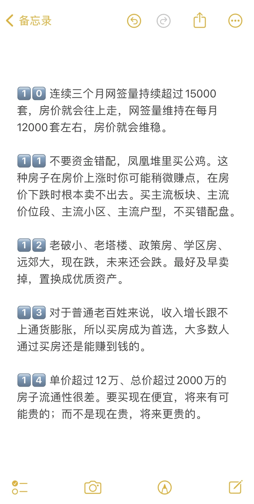 1️⃣4️⃣ 单价超过12万、总价超过2000万的房子流通性很差。要买现在便宜,将来有可能贵的;而不是现在贵,将来更贵的。