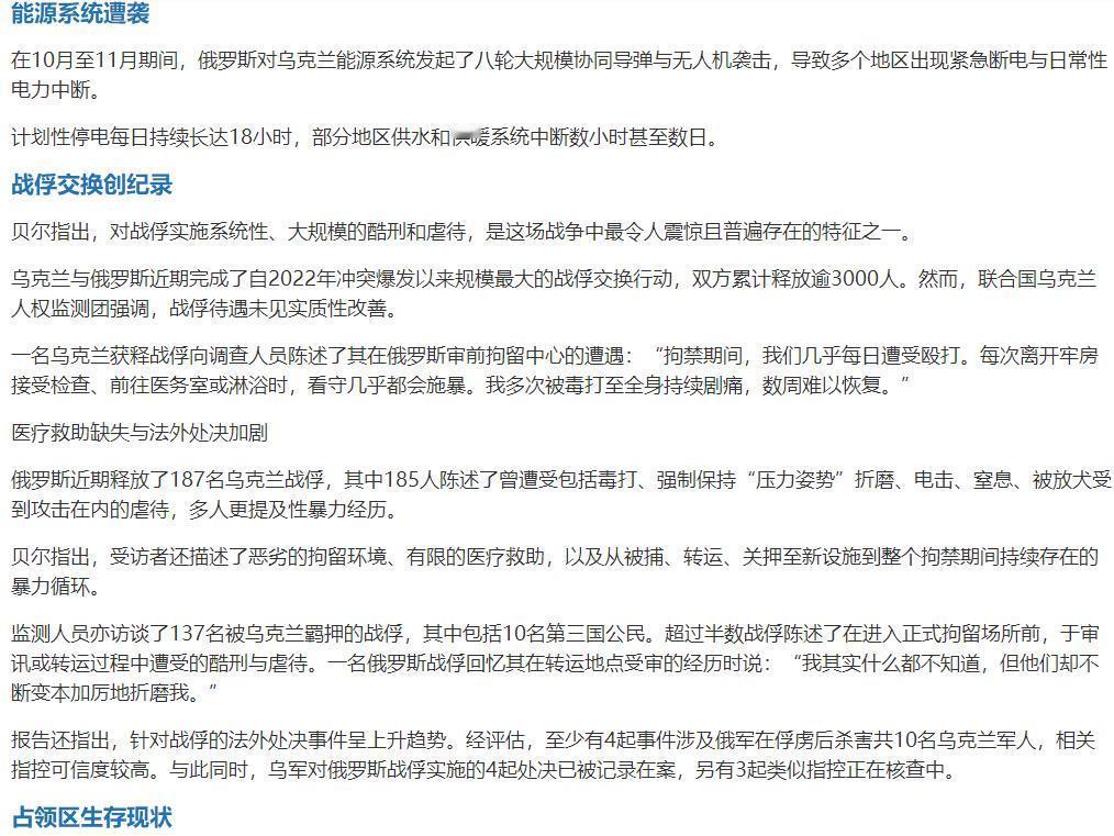 【联合国警告:乌克兰平民面临攻击升级与生存困境加剧】随着俄罗斯全面入侵乌克兰即将进入第四个年头,联合国人权监查员在周二发布的最新报告中指出,乌克兰平民正面临几乎每日不间断的袭击和日益加剧的生存困境。全网热点共创计划 烽火问鼎计划联合国旗帜鲜明地定性“俄罗斯全面入侵乌克兰”,令“茧中”黄皮肤俄罗斯人情何以堪?一周前《联合国大会通过决议要求俄罗斯立即归还被绑架的乌克兰儿童》,明确联合国常务理事国俄罗斯“绑架”乌克兰儿童。因此,任何为俄罗斯兽行辩护的论调,都只有缺乏人性的人才有可能发出来。