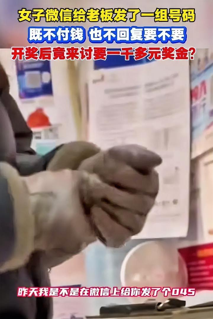 大家评评理吧,女子买彩票,微信给老板发了一组号码,第二天找老板要1000元奖金,结果老板不给,说是彩票没打。 老板表示:“你虽然给我发了一组号码,但是我问你打不打?你也不回复,也不给我转钱,我干嘛要给你打彩票”? 女子称:“我发了号码就代表要打,虽然没给你钱,但是你可以从奖金里扣除掉2块钱,今天你必须给我钱”。 老板表示本店概不赊欠,没给钱就是不能给打彩票。 大家觉得这张彩票到底打没打?二人有微信好友,看起来平时很熟悉,以前应该也有过类似的交易,结果偏偏这次中奖了出了意外。 如果真打了彩票,女子想要回来,估计也没可能,毕竟没有达成交易。