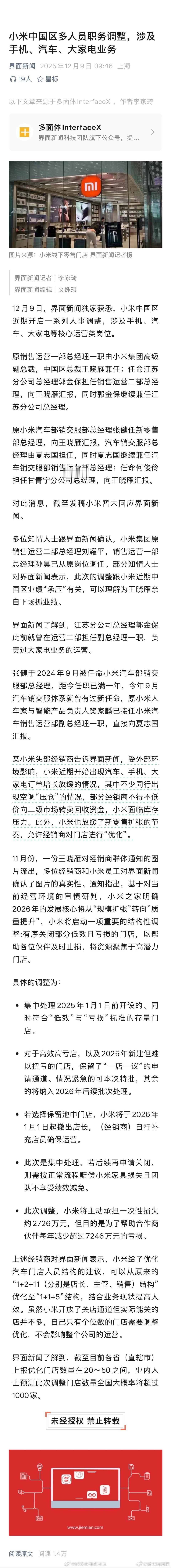 小米将承担门店调整损失约2726万元原来开小米店也有亏损的,应该主要是25年新建的店,小米确实应该规范下区域建店规模和店盈利水平,这次调整后还有1000家,但应该都是很能打的店了。
