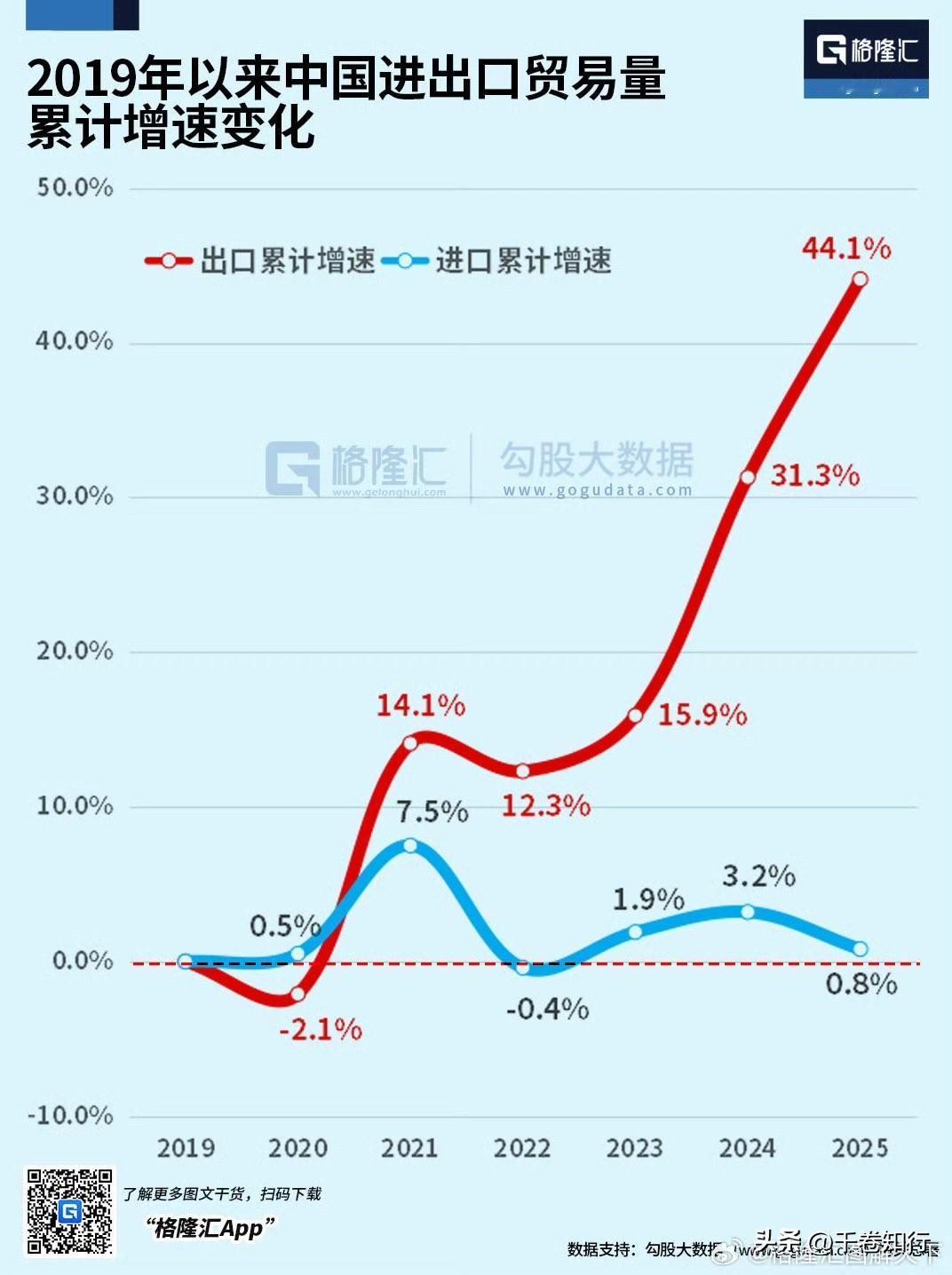 【出口狂飙进口趴窝?这不是经济强劲,这是国家级的“内需厌食症”】 刚看了格隆汇这张图,真是把咱们的家底儿抖了个底掉。你看那条红线,出口增速一路狂飙到了44.1%,看着挺吓人对吧?不知道的还以为中国制造又再次统治地球了。但你再看那条趴在地上的蓝线,进口增速只有可怜的0.8%。这俩数据往一块儿放,哪怕你是个卖菜的都能看出不对劲:这一边是拼了命地往外卖东西,另一边是死活不肯掏钱买东西。 这说明什么?说明这几年吹得震天响的“内循环”彻底熄火了。咱们的老百姓兜里是真没钱,或者有钱也不敢花。工厂开足马力生产,不是因为生意好做,而是因为国内卖不动,只能降价倾销到国外去续命。这哪是什么贸易顺差,这就是把国内过剩的产能,硬生生挤到了别人的地盘上。这也就是为什么川普和欧盟现在天天嚷嚷着要加关税,换你是老外你也急,凭什么你光赚钱不消费,把我的市场当垃圾场?