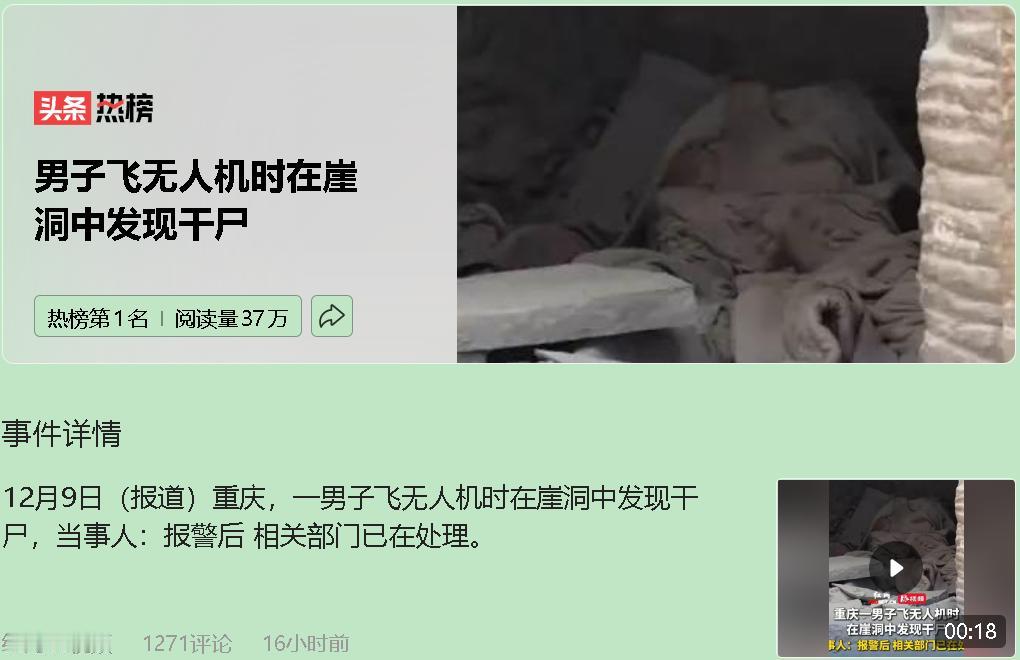 无人机扫过山崖,洞里竟躺了具干尸!旁边毯子衣服看着旧,可塑料瓶生产日期是2018——这哪是考古现场,简直是现实版悬疑剧开场。 最让人后背发凉的,是那种新旧交织的诡异感。尸体都风干了,像过了很多年,但身边的塑料瓶却“新鲜”得像昨天刚扔的。网友脑洞炸了:是失联的驴友,还是古代的悬棺?专家也摇头,说这位置不属已知岩棺群,谜团直接拉满。 说白了,科技让我们看得更远,却未必看得更懂。无人机立功了,没它发现不了这险峻洞穴;飞手也够冷静,立马报警没乱动。但网上已有人传照片瞎调侃,这真挺过分的。面对逝者,猎奇心该收收了,敬畏心才是底线。 那个2018年的塑料瓶,像颗钉子扎进故事里。它提醒我们,这些崖洞对古人是归宿,对今人却可能是陷阱。探险的浪漫背后,是对自然和规则的尊重。重庆无人机协会赶紧发了倡议:不飞禁飞区、不碰敏感点——这都是用教训换来的。 我看,这大概率是一起令人心酸的现代意外。警方已采DNA入库,正全力查证。我们等真相就好,别消费逝者。像那位飞手一样,害怕之后选择负责任,才是科技时代该有的温度。 无论如何,谜底总会揭开。只愿每次这样的发现,唤醒的不是猎奇,而是对生命的共同敬畏。