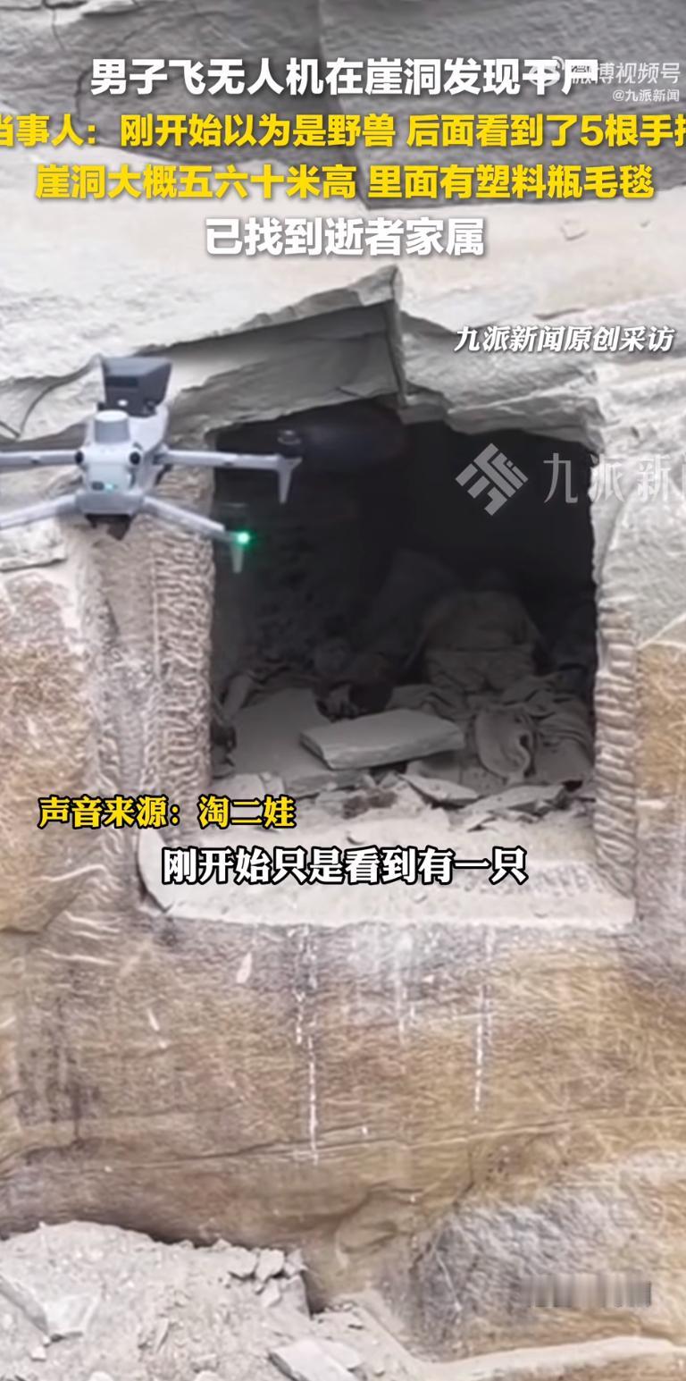 重庆男子“淘二娃”用无人机拍摄崖洞时,意外发现一具干尸。他回忆:“刚开始以为是野