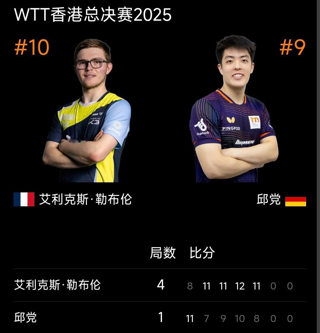 A.勒布伦晋级八强! WTT香港总决赛2025 男单首轮,法国的艾利克斯.勒布伦以大比分4比1战胜德国邱党晋级八强! 邱党是当今为数不多的直板高手,与菲利克斯.勒布伦打法相近,而艾利克斯与其弟菲利克斯经常训练比赛,对直板打法相当熟。本场比赛艾利克斯相当兴奋,打得积极主动,在首局输了之后,连扳四局拿下胜利! 1/4决赛,艾利克斯.勒布伦对阵王楚钦与松岛辉空之间的胜者!