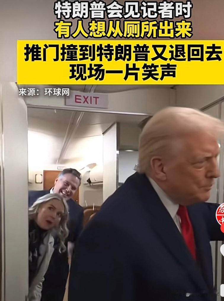 特朗普在厕所旁接受采访,不料被如厕的人推门撞到,特朗普一说话,这人被吓到还关上门不好意思出来了,现场大笑。 到底是谁在使用空军一号上的厕所,就连白宫新闻秘书都很好奇,挤上前拉门看看到底是谁!
