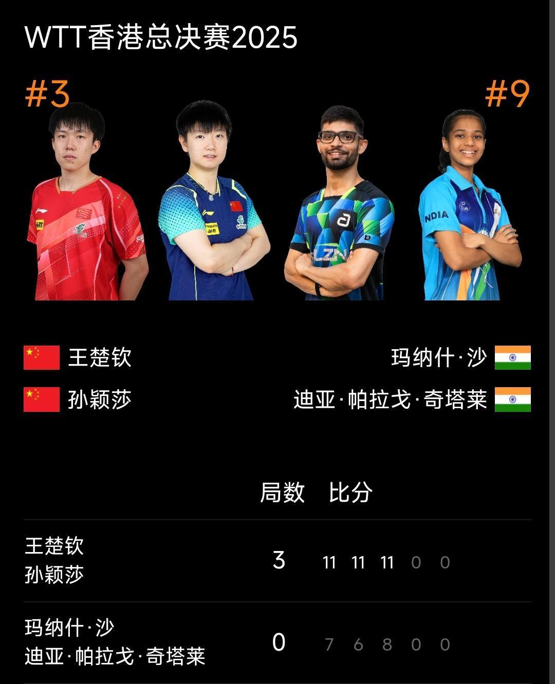 孙颖莎/王楚钦小组赛开门红! WTT香港总决赛2025 混双小组赛,国乒组合王楚钦/孙颖莎以大比分3比0战胜印度组合塔卡/沙阿,取得小组赛开门红! 混双首入总决赛,今年赛制有所不同,先打小组循环赛,两个小组的前两名晋级半决赛!虽然国乒两组合都在第一组,但也是大概率携手晋级的! 恭喜国乒!
