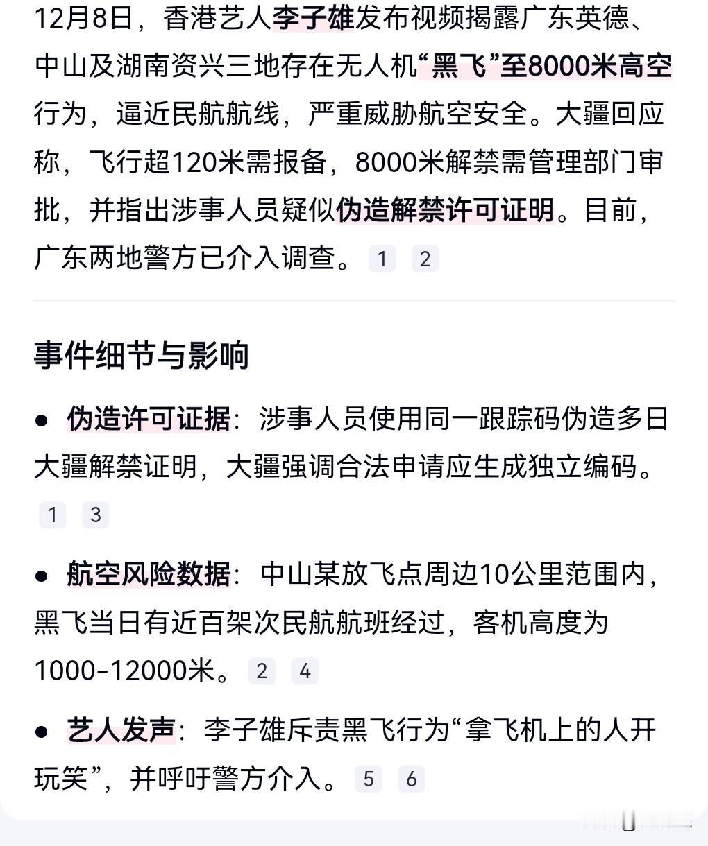 一定要彻查无人机黑飞事件。 近日,李子雄怒斥无人机黑飞的事情。 他说要有无人机器人飞到8千米的高空。 这确实太危险了,要是飞机相撞那就麻烦了,那可是一飞机的生命啊。 这个事情必须要彻查。 李子雄这个事情曝光的非常的好,引起了警方的重视。 要大力打击这种无人机黑飞的情况。 飞这么高,确实离谱。 毕竟天上有很多的飞机呀。