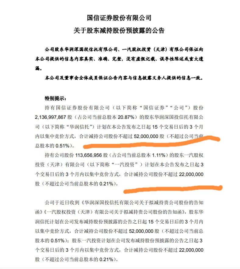 什么情况?今天十大头部券商股中涨的最好的是国信证券,收盘上涨0.54%。 国信证券目前总市值1328亿元,在10家头部券商股中市值排名第九名。 但奇葩的是国信证券昨晚刚披露了股东减持预披露计划。第二大股东和第七大股东合计减持七千四百万股,减持股份总市值高达9.6亿元。这个瓜有点大啊! 为何国信证券股价今天却涨的这么好?这是妥妥的利空当利好炒啊! 还有一种可能,就是大家觉得国信证券目前动态市盈率只有10.9倍,太低估了,大家股涨通过,谢谢大股东把发财机会让渡出来?
