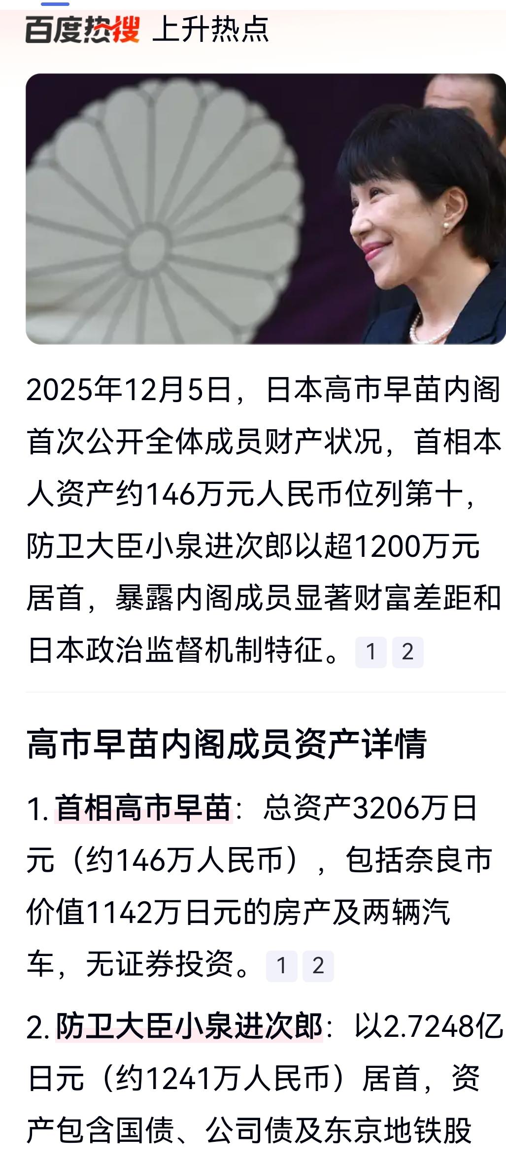 高市早苗这两张牌,用的三十六计哪一计? 第一张,公布全体内阁个人资产,高市早苗折合人民币146W,约相当于天朝最低岭捣仁村组长,引起吃瓜群众一片哗然与嘲弄。 第二张,带领全体内阁集体降薪20%。由此可见,小日子已至穷途末路,如不悬崖勒马,必将粉身碎骨!同时也充分证明,小日子已揭不开锅了,要勒紧裤腰带渡过难关! 翻遍孙子兵法,摸不出头绪了,高市早苗用的到底三十六计“声东击西”、“抛砖引玉”、“浑水摸鱼”哪一计呢? 想必作为孙子兵法的发源地与鼻祖,我们已做好了一切应对措施,必将彻底粉碎高市早苗及其一切反动派的阴谋与伎俩!