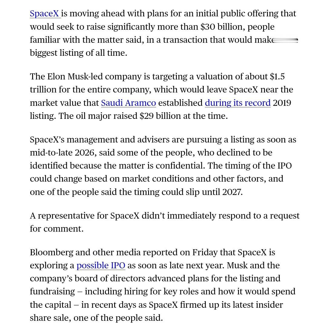 彭博社:SpaceX 计划于 2026 年下半年 IPO,目标以 1.5 万亿美元的估值融资超 300 亿美元。这将超越沙特阿美石油公司 2019 年的 IPO,成为有史以来最大规模的 IPO。接下来这半年,SpaceX 没有任何人敢影响星链业务的扩张了。星链和营收增长挂钩,营收又和估值挂钩。作为对比,特斯拉成立 20 年股权 + 债权累计融资总额不过 340 亿美元。太空超算业务这么重要,以致于 Elon Musk 放弃了 SpaceX 不上市的老原则,一把融了这么多。