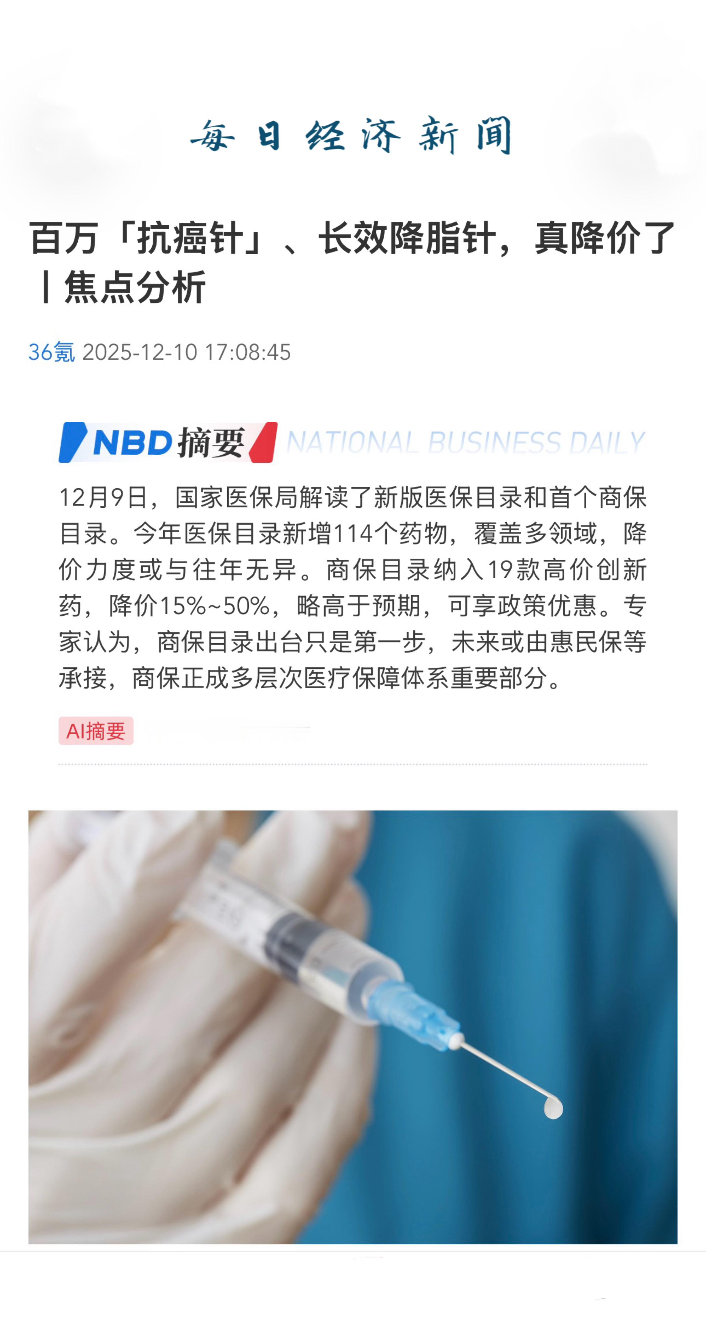 【 焦点分析 | 百万「抗癌针」、长效降脂针,真降价了! 】 (每日经济新闻 2025-12-10 17:08:45 ) 『 摘要:12月9日,国家医保局解读了新版医保目录和首个商保目录。今年医保目录新增114个药物,覆盖多领域,降价力度或与往年无异。商保目录纳入19款高价创新药,降价15%~50%,略高于预期,可享政策优惠。专家认为,商保目录出台只是第一步,未来或由惠民保等承接,商保正成多层次医疗保障体系重要部分。 』 今年的医保目录,纳入了多款“重磅新药”。 12月9日上午,国家医保局在北京召开沟通会,对两天前在广州“2025创新药高质量发展大会”公布的新版国家基本医保目录,及首个《商业健康保险创新药品目录》(“商保目录”)名单,进行了详细解读。 国家医保局方面在沟通会上提到,今年医保目录新增药物114个,覆盖肿瘤、抗感染、慢病等诸多领域。 其中,包括慢病领域集中“更新换代”的新品——GLP-1降糖/减重药替尔泊肽;半年打一针的降脂药英克司兰钠;治疗痛风“富贵病”的多替诺雷片均被纳入。另外,“过敏救星”司普奇拜单抗、国产流感新药玛舒拉沙韦片、长效生长激素产品怡培生长激素等也纷纷被纳入医保。 价格上,国家医保局没有披露平均降幅。但从一些公开渠道中可以推测,今年降价力度或与往年的50%~60%无异。如长效生长激素怡培注射液,据羊城派报道,纳入新版药品目录后,常用规格每支约850元,降幅接近50%。 此外,首次新增商保目录,定位解决高价创新药支付困境,与医保目录相衔接,成为今年“国谈”的重要看点。 本次,商保目录共纳入19款产品,包括5款售价百万元、被网友称为“抗癌针”的CAR-T疗法,2款新型阿尔茨海默病药物和多款治疗肿瘤及罕见病的药物。其中罕见病药物在目录中占比接近1/3。 36氪获悉,19款产品的“降幅”在15%~50%不等(5%为一档,视产品特性而定),略高于行业此前预期的30%以内的降幅区间,但整体低于往年医保目录的降幅。有产品被纳入商保目录的企业人士提到,议价过程相对友好,并未出现比较极端或无法承受的情况,“可以体现产品价值”。 [ 商保内新药降价15%~50%,意味着什么 ] 据了解,今年商保目录的入选要求严格,需满足“创新程度高、临床价值大、不能被基本医保目录替代、推荐多元化支付”四大特征,因此总体入围率并不高。 以最初通过形式审查的121个产品这一数字为参考,首批商保目录的谈成率只有15%。 在社交媒体上,被网友称为“抗癌针”的CAR-T,是本次被纳入商保目录的代表产品。5款申报的CAR-T全员中选,占目录名单总数的1/3。这也是CAR-T首次在国家层面拥有了自己的报销路径。 既往国家医保目录谈判,行业内存在着年治疗费用“50万以上不谈、30万以上不进”的隐形规则,因此,售价超过百万元/针的CAR-T曾在谈判中“陪跑”多年,如今首次在国家层面拥有了自己的报销路径。 对于药企来说,这意味着可以不再像过去那样“逐省”与不同的商保保产品谈判。 此外,商保目录内产品可享受“三除外”政策优惠,即不纳入基本医保的自费率指标、不纳入集采中选可替代药品的检测、不纳入按病种付费的范围。 这相当于在药企最关注的DRG/DIP控费体系上,撕开了一道口子,对于打破“高价药入院难”的困境,有着极强的现实意义。 众所周知,CAR-T受限于个性化定制问题,生成成本高,终端价格很难降下来,导致产品销售压力大。 其中,2021年获批、上市最早的复星凯瑞的阿基仑赛注射液,如今的年销售规模为3亿~5亿元;紧随其后获批的药明巨诺的瑞基奥仑赛注射液累计销售额只有5亿元左右。 因此,进入商保目录、打通入院通道和放量渠道,是CAR-T企业如今的关键一役。 从保司的角度,形成统一的全国性目录体系,既可以为其省下自己设计产品时,投入到药物价格测算、协商等环节中的成本和资源,同时也能获得更大程度上的让利。 因为,商保目录产品的15%-50%降幅,并非药企直接降价,而是以药品折扣形式直接给到保险公司,相当于为其提供承保方面的优惠(双方之间的具体结算方式目前未定)。 简单理解,就是让保司和药企按照私下约定的折扣价结算来实现控费,即保险公司无需按对外公示的药价或理赔金额全额与药企结算,从而降低自身实际支出。 假如一款新药原价100万元,若商保承诺赔付50%,其余由患者自付;在商保目录谈判中,如药企与保司达成30%的折扣,则意味着保司向药企直接支付的药费,由50万降低至35万,节省了可观的理赔费用。 不过,这是一种基于规则的简化价格测算。商保的赔付规则复杂,具体触发条件、报销范围界定等有很强的个性化,实际执行中可能有所不同。 有关专家在沟通会上也提到,理论上,节省的费用可以折算到保险产品售价中,降低保费,吸引更多人投保;也可以直接当作利润,提升产品盈利空间。 “保司如果直接和药企谈,很难拿到目录中的折扣区间,因此这部分让利有意义。但坦诚讲,保司本来也会通过各种产品设计、供需关系方式来维护权益,所以这些钱价值有多大、能带动多少积极性,目前可能不好判断。因为保司更关心这项政策能否帮他们导流,现在他们的投流获客成本太高。”一位药企人士认为。 [ 惠民保等商保,新机会来了?] 多位药企人士认为,出台商保目录只是第一步,后续如何落地才是关键。当下,尽管药企和保司双方对目录后续的实际落地问题仍有顾虑,但相对达成的一项共识在于:未