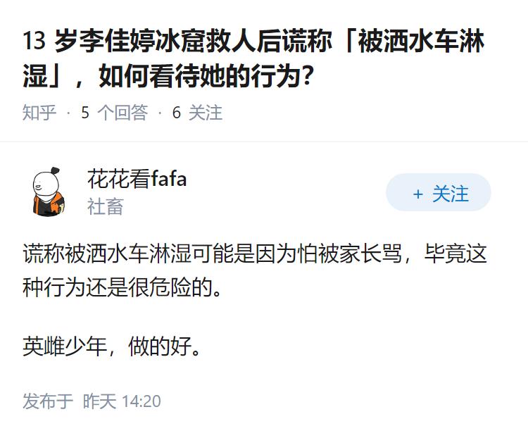 13 岁李佳婷冰窟救人后谎称「被洒水车淋湿」,如何看待她的行为?