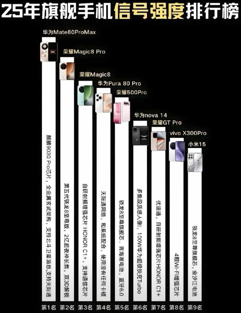 近日有博主放出了2025年旗舰手机信号强度排行榜,华为mate80ProMax轻松拿下第一。