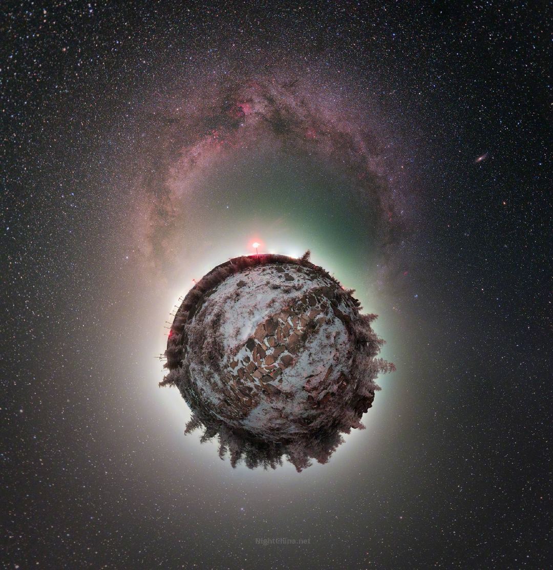 当地平线悄然收拢成圆,世界以“小星球”的方式折叠。覆雪的山脊与缀满霜华的树影蜷缩在中心,仿佛宇宙掌心的一粒微尘。而那条璀璨的银河,弯成一道光环,像是为这片人间加冕。我们在尘埃之上,亦在星海之中。摄影师:徐康,2025年10月19日摄于 河北 张家口赤城县冰山梁。索尼A7R3(天文改机) + 适马15 1.4 DG DN鱼眼 + 一思佛SEM3赤道仪,天空部分:赤道仪跟踪,ISO 100,f/1.4,单张曝光120秒;地景部分: 关闭赤道仪,ISO 3200,f/1.4,单张曝光20秒,多张全景合成。关注Steed的星空 ,每日推送星空佳作。更多图片请见 夜空中国 :NightChina.net
