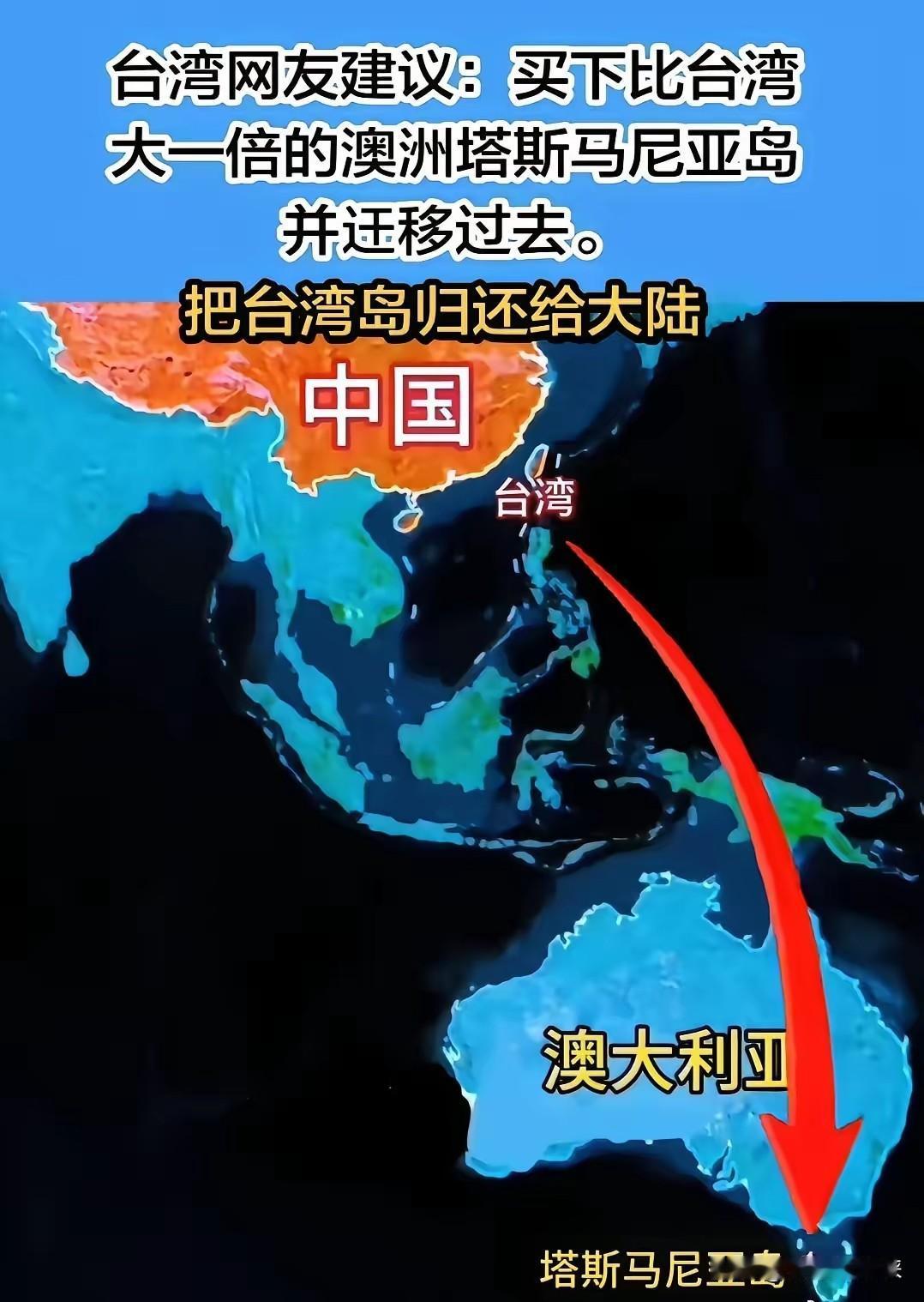 有台湾网友建议,去澳洲买下一个比台湾更大的岛并迁移过去,把台湾归还给大陆! 人都可以走,台湾那边简直人类智商洼地,遍地都是于北辰这种,最可笑的就是那句,台湾最可爱的是人,趁早都走,我们才不留。,包括台积电都带走,天天说我们惦记台积电,都拿走,但是话要讲清楚,必须把台北故宫里的中国人的宝贝留下。 但买地的钱得台独分子众筹。台湾省的财富是中国的,当年老蒋带过去的黄金和故宫的国宝都得留下!