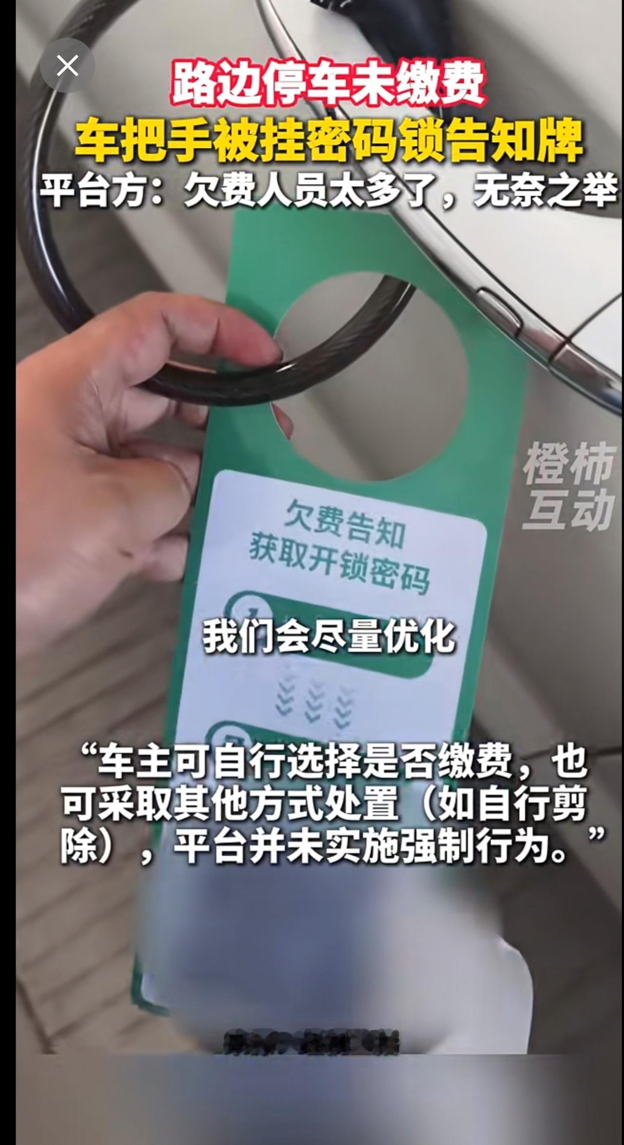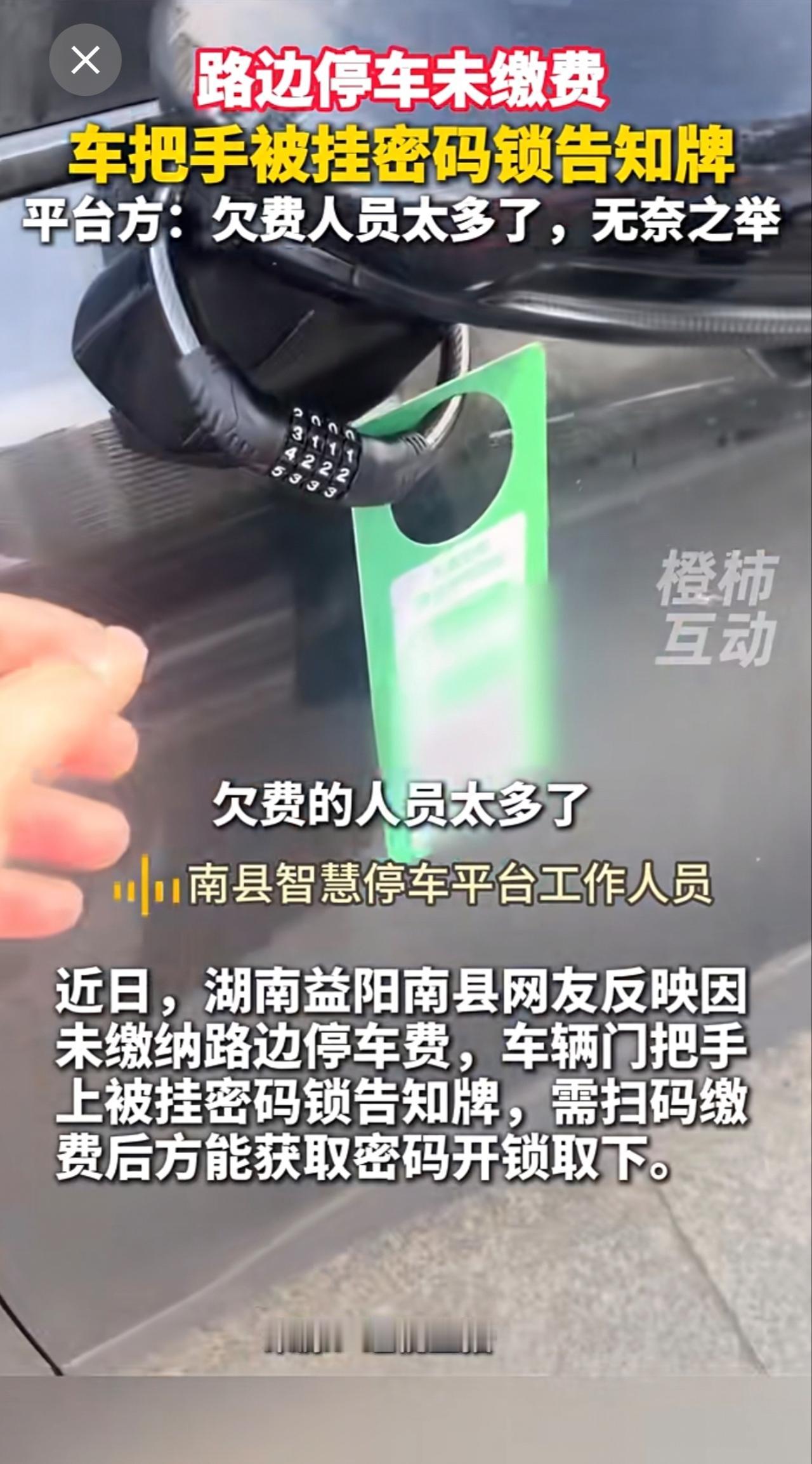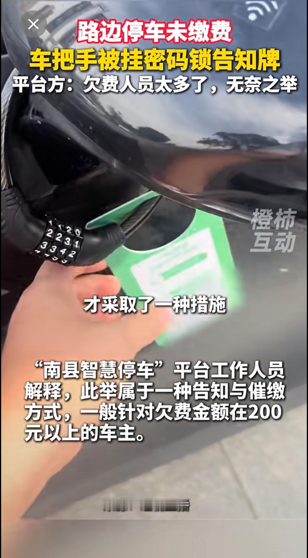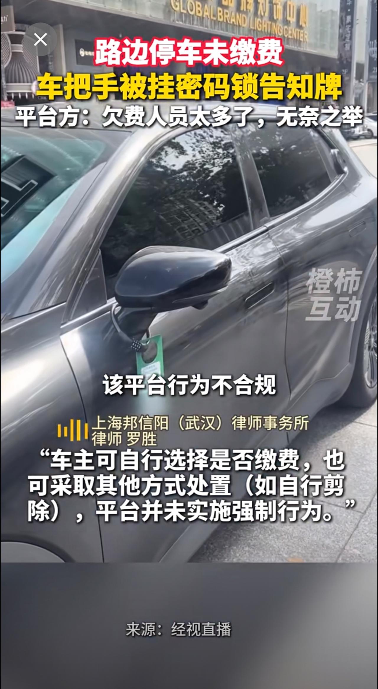 路边停车未缴费车门把手被挂密码锁,平台方:针对欠费200元以上,不影响行驶,可自行处置。