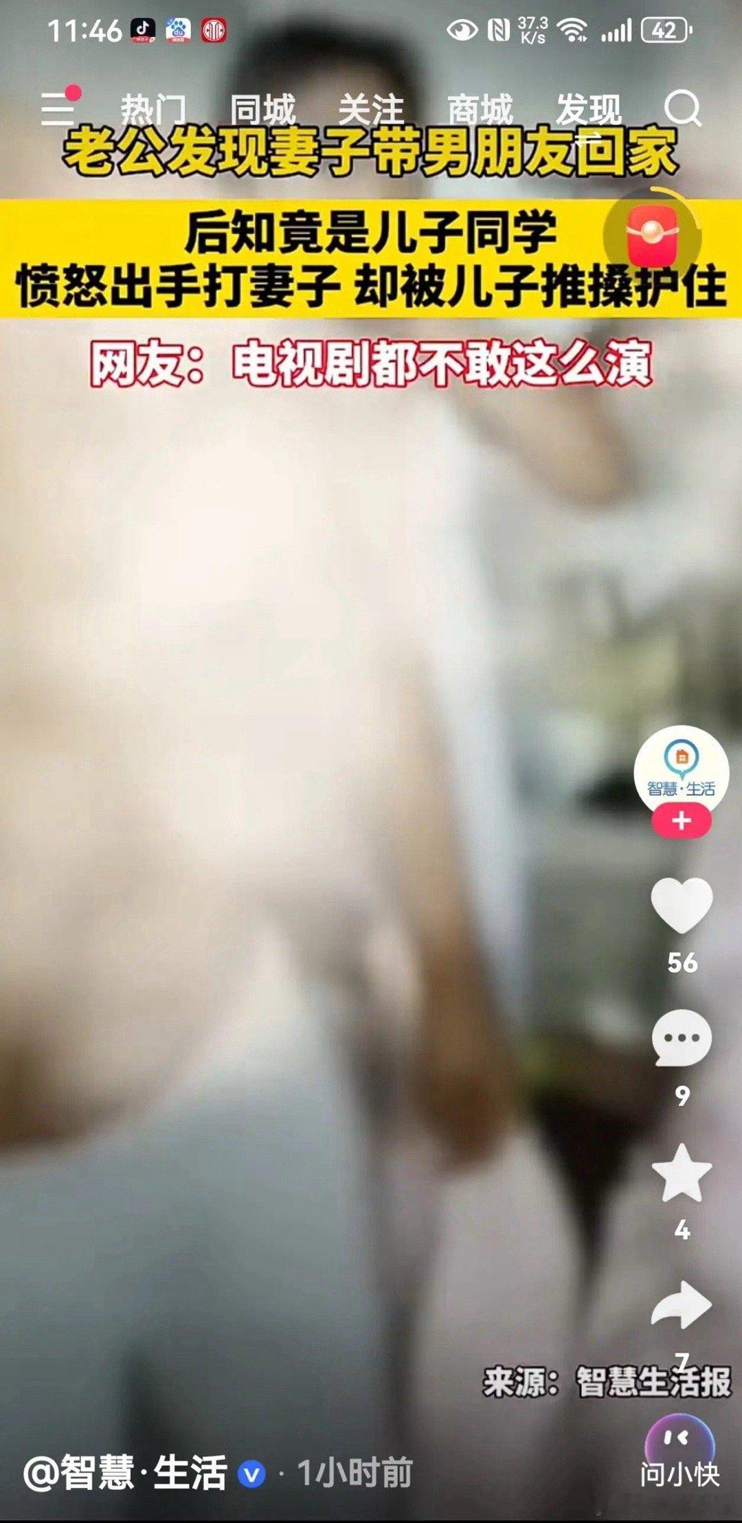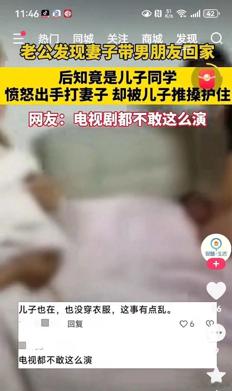 刚看到一视频,一老公回家发现他的妻子居然带了男朋友回家,老公气愤不已。愤怒之下,就挥拳打妻子,而此时他的儿子跑出来护住母亲,经询问后,才得知,老婆的男朋友居然是儿子的同学,更让人惊掉下巴的是,当时儿子也在场,而且也没用穿衣服。这是个什么场面?这位母亲是怎么想的?太让人无语,网友也都说,电影都不敢这么拍!