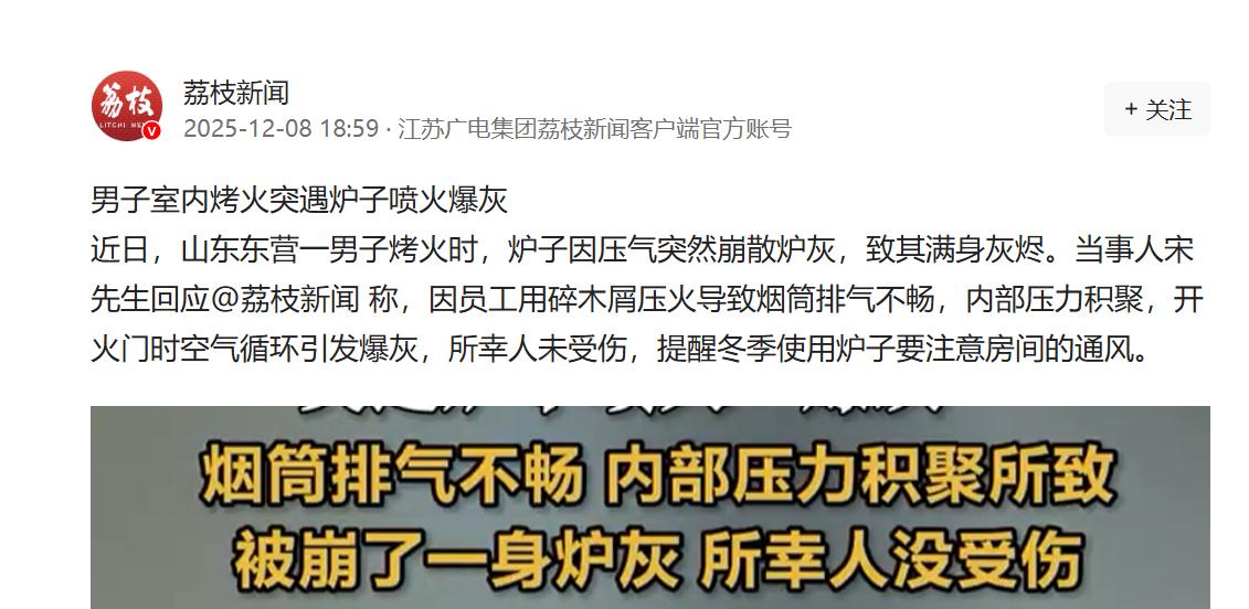 “太吓人了!”近日,山东东营,一男子室内点炉子烤火,往里面加了碎木屑想要更暖和一点,但没想到木屑把火压住,温度一直上不来,就在男子开炉门查看时,炉子突然爆炸,将男子崩在地上,衣服也全都沾满了灰。网友:威力真猛! 12 月 6 号这天,太阳一落山,寒意就跟钻空子似的往屋里跑,裹再多衣服都觉得不顶用,宋先生在家待着,实在扛不住这冷劲儿,家里虽有别的取暖法子,但老一辈传下来的生炉子,又快又暖和,想着就用这 “土办法” 凑活一下,可谁能想到这图省事的举动,差点出了大事现在想想都忍不住说一句 “太吓人了!” 当天下午宋先生把炉子点着后,看着炉膛里的火苗忽明忽暗,总觉得不够旺身上暖得慢,他琢磨着,碎木屑易燃,要是多加点,肯定能让火瞬间窜起来,屋里立马就能热乎。 这么一想他就没多想,抓起一堆碎木屑一股脑全倒进了炉膛里,本以为能等来熊熊烈火,结果事儿与愿违,过量的木屑把原本就不算旺的火苗死死压住了,就跟盖了床湿棉被似的,火路被堵得严严实实,炉子里光冒烟,火却越来越小,眼看就要灭了。 宋先生一看这情况,心里就有点急了,好好的想烤个火,怎么还越弄越糟,他也没多想下意识就伸手去拉炉门,想看看到底是哪儿出了问题。可就在炉门打开的那一瞬间,意外发生了,“轰” 的一声巨响,那声音来得太突然,压根没给人反应的时间,一股强烈的气浪夹着黑乎乎的烟尘,顺着炉门就喷涌了出来,宋先生整个人瞬间被这股力道推倒在地,重重摔了一跤。 还没等他从地上爬起来,漫天的炉灰就跟下雨似的落下来,把他从头到脚盖了个严严实实,那一刻宋先生脑子里一片空白,只想着赶紧躲开,生怕炉子再炸一次。 他顾不上身上的疼,连滚带爬地往远处跑,直到跑出去好几步,确认炉子没再出动静,才敢停下脚步,回头看看那 “惹祸” 的炉子,心里又怕又懵。 等惊魂未定的宋先生缓过劲来,慢慢靠近查看,才发现除了自己加的木屑太多把火压灭了,炉子的烟囱排气口不知啥时候也堵了,那些没完全燃烧的木屑,在炉子里缺氧的情况下,产生了不少可燃气体,就跟个装满高压气体的罐子似的,他一打开炉门外面的冷空气带着氧气涌进去,瞬间就引发了爆燃,也就是咱常说的 “回燃”。 后来宋先生对着镜子一看,自己满身都是黑灰,衣服、头发、脸上全是,不知道的还以为刚从煤窑里钻出来呢,不过万幸的是这次喷出来的主要是气浪和冷灰,没有持续的火苗,他除了受了点惊吓、摔了一跤,皮肤居然没被烧伤,这也算是不幸中的万幸了。 12 月 8 号这事儿被媒体报道出来后,网友们都惊呆了,纷纷留言说 “太吓人了!”“威力真猛!”。很多人都没想到,生个炉子取暖还能出这么大的危险,其实咱冬天用炉子取暖的人不少,总觉得这是老法子,肯定没问题可宋先生这事儿提醒了大家,这里面的隐患真不小。 后来才知道冬天用炉子最忌讳的就是填太多燃料把火压死,更得时刻盯着烟囱通不通畅,要是燃料没完全燃烧,又遇上烟囱堵塞,炉子里就容易积聚可燃气体,一旦打开炉门,氧气进去就容易引发爆燃,那威力可真不是闹着玩的,宋先生这次是运气好,只是崩了一身灰,要是换个更密闭的屋子,或者填的燃料更多,后果真的不堪设想。 (信息来源:荔枝新闻)