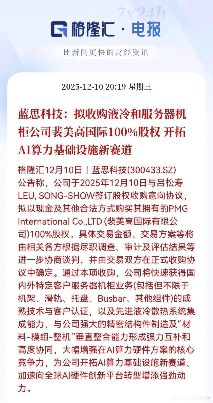 蓝思科技这次收购,步子迈得果断又及时。不用从零开始折腾,直接买下一家现成的公司,把服务器机柜和关键的液冷散热技术,全部打包收入囊中!相当于瞬间拿到了,进入AI算力赛道的高端门票,特别是宝贵的客户认证,这可是花多少钱都难买的!这笔买卖和蓝思的老本行,精密制造堪称天作之合。能把自身的金属加工、垂直整合能力,和新获得的机柜、散热技术无缝对接,快速拼出AI硬件方案的核心竞争力!在AI爆发急需基础设施的当口,这无疑是给公司未来业绩的增长,装上了一台强劲动力的新引擎。