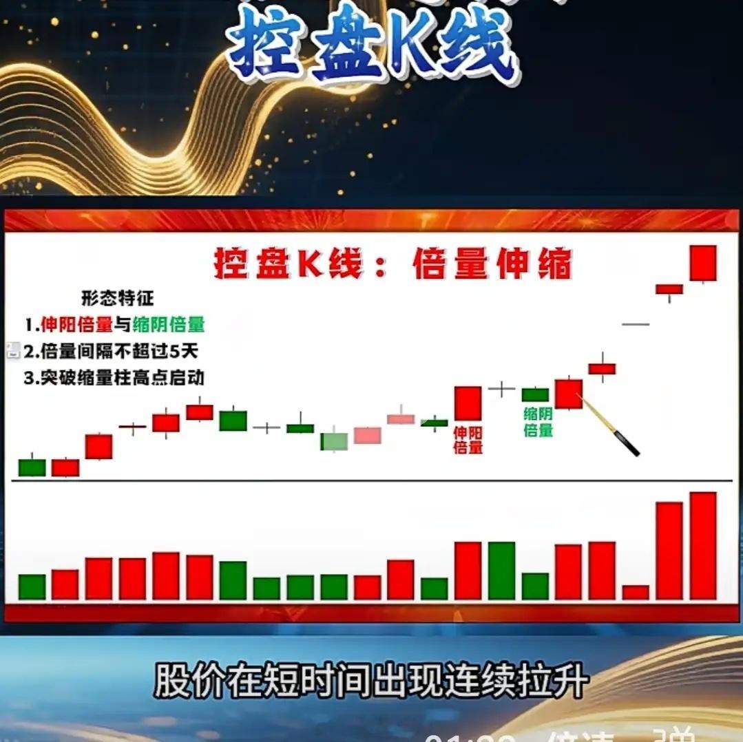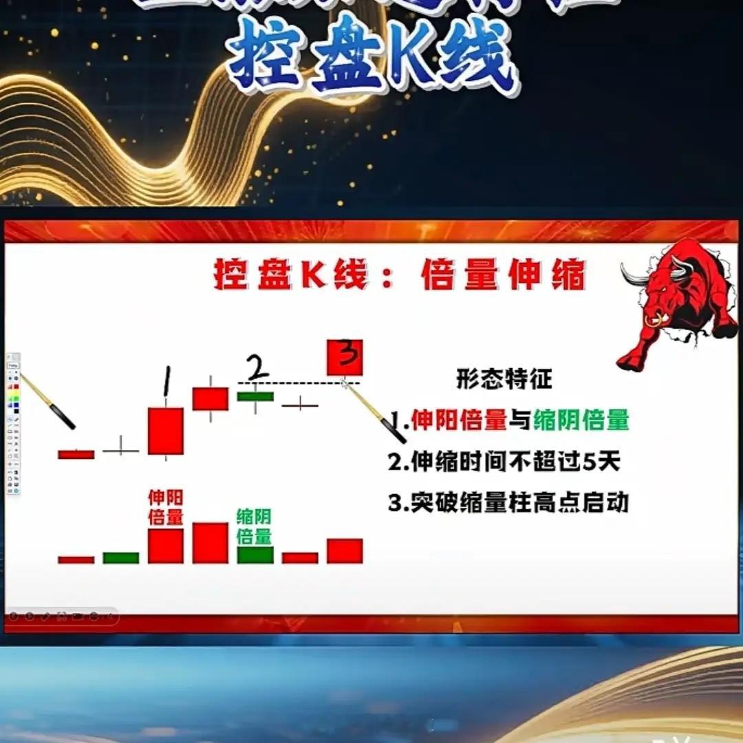 控盘K线伸缩倍量这是伸阳倍量+缩阴倍量,近距离K线组合,是主力试盘、洗盘和锁仓的信号,站上缩阴K线攻击线最高价,为拉升启动点,止损设伸阳最低价。 一、定义 伸阳倍量:阳线,成交量比前一日放大一倍以上,主力试盘/建仓,分歧转强。缩阴倍量:阴线,成交量比前一日缩小倍量,主力洗盘锁仓,抛压轻。组合要求:两者间隔1-2天为佳,不超5天,位置在上升/震荡趋势,下跌趋势勿用。 二、用法 买入:放量站上攻击线,分批介入;优先选缩阴后次日或隔日突破。止损:严格设在伸阳倍量K线最低价下方,破位立即离场。卖出:反弹无力站上攻击线、量能萎缩或遇均线压制,卖出。趋势:站上攻击线且突破20/30日均线,成功率更高;多组伸缩倍量层层递进,趋势更稳。三、记忆口诀 伸阳倍量试盘强,缩阴倍量洗盘良;攻击线上放量站,缩量不站快离场;止损就设在阳倍低。