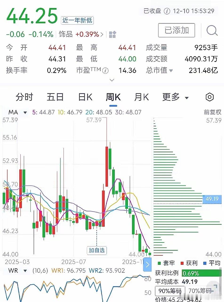 老凤祥股价创近一年新低老凤祥是国内知名的金银珠宝首饰品牌,业绩表现也是不错的,2025三季报的净利润是饰品行业最高的,股息率是4.63%,也不低了,可股价是持续走低,创出了近一年的新低,今日收盘于每股44.25元,总市值231.48亿元,目前股东的平均持有成本49.19元,赚钱的股东占比仅有0.69%,这又是谁能预测的呢?