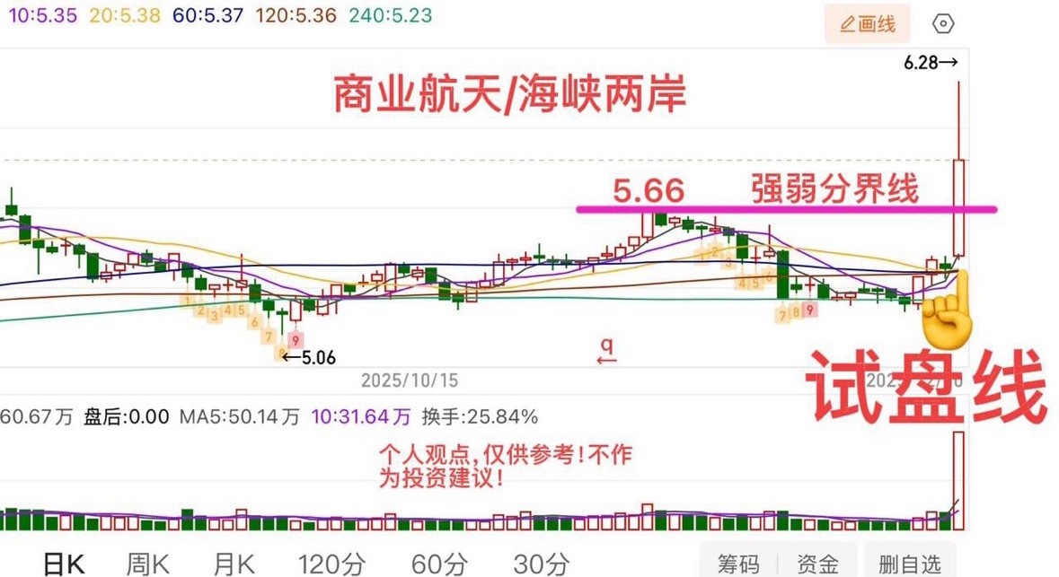 2025.12.10周三收评: 探底回升,本质不变,等待变盘! 大盘观点:指数的看点仍然是均线的得失,今天走了个探底回升,回到了5/10日线附近,能收回去说明多空还是平衡状态,均线粘合就不会有变化,耐心等待变盘选择方向,当前20日线还会继续向下,对指数继续压制,但如果能够保持均线不破,尤其是下周,20日线的压力会慢慢减弱,前提条件就是均线不能有效跌破,如果能做到这一点,问题就不大,那么下周开始对多头就比较有利。 策略上,震荡盘指数并不是特别重要,关键还是个股为主,跟踪有资金介入的方向。 比如《试盘线》👉什么是试盘线? (上引线+中大阳+底部放大量+突破均线),如图所示。 在第二天回踩的低点画一条线或左边支撑作为强弱参考,回踩不破即为强,跌破则弱。 个人观点,仅供参考!不作为投资建议!