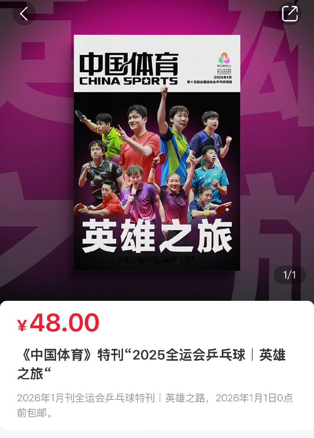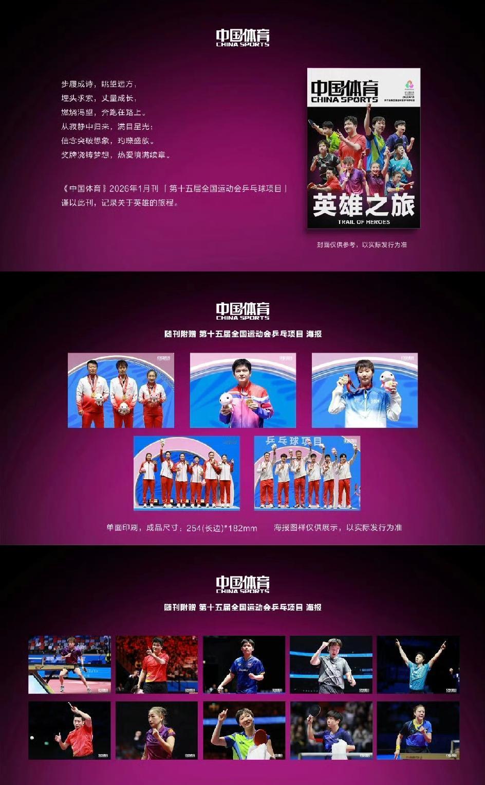 体总官方杂志《中国体育》发布2026年开年刊封面,第十五届全运会乒乓球项目特辑-英雄之旅。 封面是第十五届全运会乒乓球项目参赛奥运冠军和国乒主力组成的群像。 其中,获得第十五届全运会乒乓球项目男女单打冠军的樊振东和王曼昱位于C位。 非常有纪念意义的封面。 喜欢国乒的球迷值得收藏!