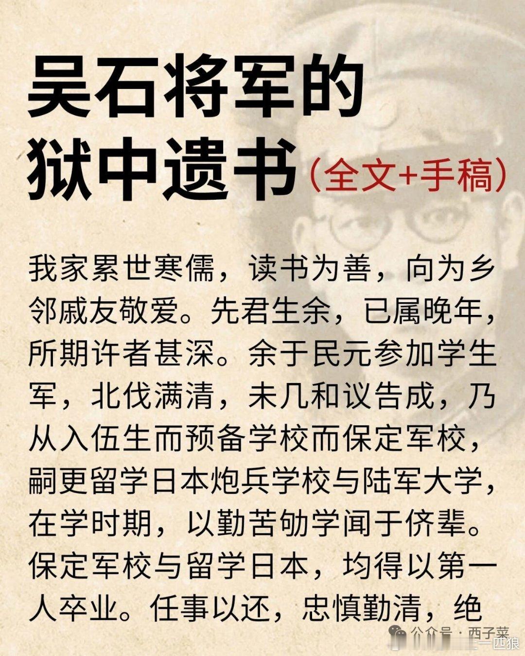 【吴石将军狱中绝笔遗书】遗书里回顾并评价自己的一生,有对清廉的坚守,有对家庭和妻子的愧疚,舍不得儿女的感情,有对著作未完成的遗憾,有壮志未酬身先死的悲情。读来令人潸然泪下。吴石遗书 吴石绝笔诗 沉默的荣耀原型(来源 : 网络 作者: 西子菜)