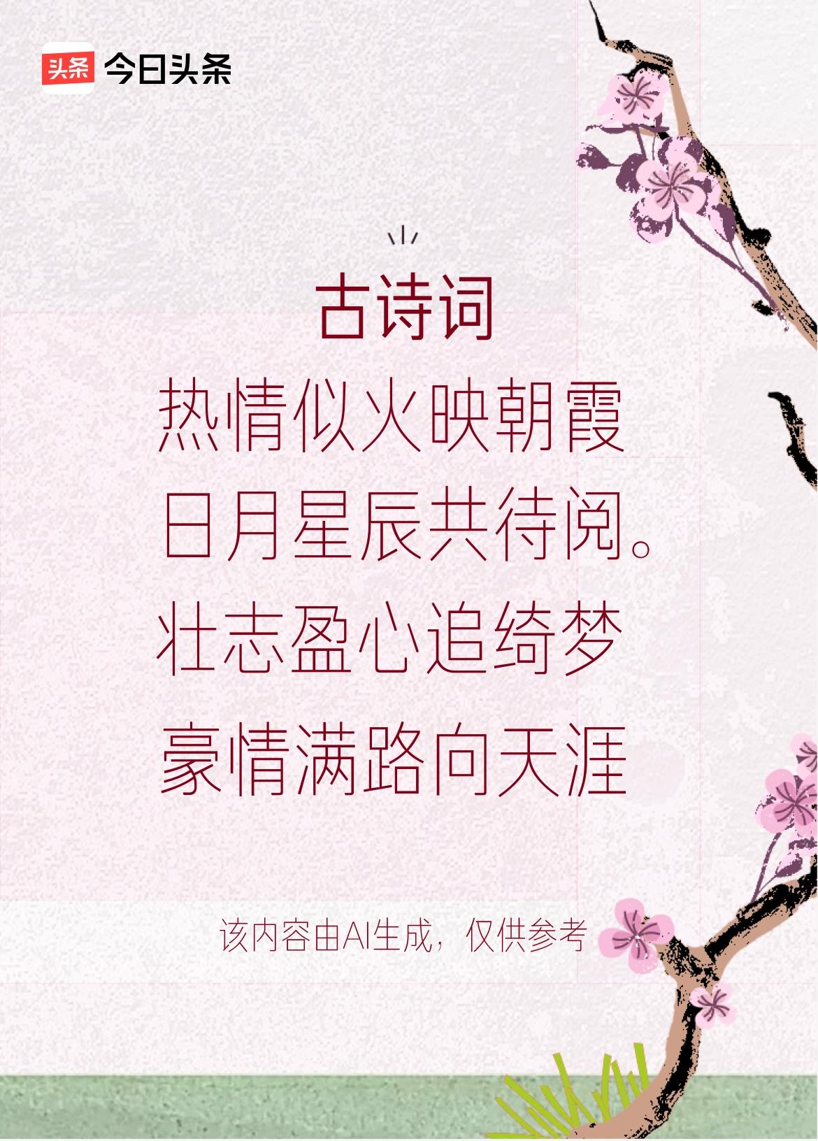 文学创作大会:热情似火映朝霞,洋溢豪情绽岁华,壮志盈心追绮梦,豪情满路向天涯。戳这里👉和我一起作诗词歌赋,赢万元大礼~