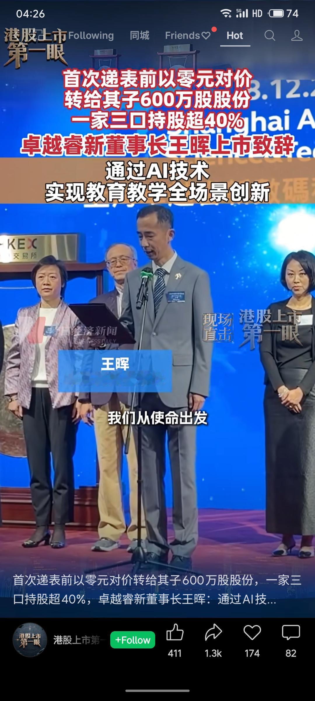 卓越睿新董事长王晖在港股上市前,以零元向其子转让600万股,致一家三口持股超40%。公司宣称通过AI技术推动教育教学全场景创新。