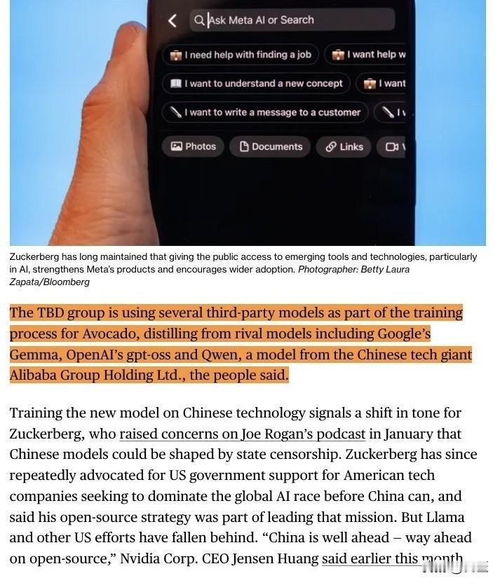 阿里牛啊!Meta用阿里Qwen炼“牛油果”, Meta 用阿里通义千问做“老师”,训练自家闭源模型“Avocado”,阿里美股闻讯一度涨 3%, 事件全景:从开源到闭源的急转弯, 据彭博社 12 月 10 日报道,Meta 正在内部代号为“Avocado(牛油果)”的下一代大模型上,首次大规模引入第三方模型进行蒸馏训练。除阿里巴巴的通义千问 Qwen 外,谷歌 Gemma 与 OpenAI 的 gpt-oss 也被列入“导师”名单。 这一动作标志着 Meta 战略方向的显著转折:从过去高举高打的 Llama 开源路线,转向封闭、可收费的商业模型,预计 2026 年第一季度亮相。 技术细节:为什么选 Qwen? 多语言优势:Qwen 在中文及亚洲语料上表现突出,可弥补 Llama 系列在非英语场景中的短板。 参数效率:Qwen-72B 在多项基准测试中与 Llama-70B 打平,但推理成本更低,适合蒸馏。 合规与数据:阿里在国内拥有海量电商、支付场景数据,为 Meta 进入亚洲市场铺路。 消息传出后,阿里巴巴美股 BABA 盘中直线拉升,最高涨幅达 3%,收于 160.74 美元,创近两周新高。 投资者逻辑: 技术背书——全球顶级大厂采用,验证 Qwen 实力; 商业前景——潜在授权费或云服务增量; 地缘溢价——中美 AI 合作稀缺性带来的情绪溢价。 Meta 内部震荡:人事与路线同步洗牌 为配合“Avocado”计划,扎克伯格亲自挂帅 TBD Lab,并挖来 ScaleAI 创始人 Alexandr Wang 任首席 AI 官。 同时,开源灵魂人物、图灵奖得主 Yann LeCun 被边缘化,FAIR 团队大幅缩编,600 余人转岗或离职。 这一系列动作显示:Meta 已从“研究驱动”切换到“产品+盈利”优先的战时状态。 阿里AI产业链 ai阿里 阿里ai引擎 阿里AI全球化 Meta