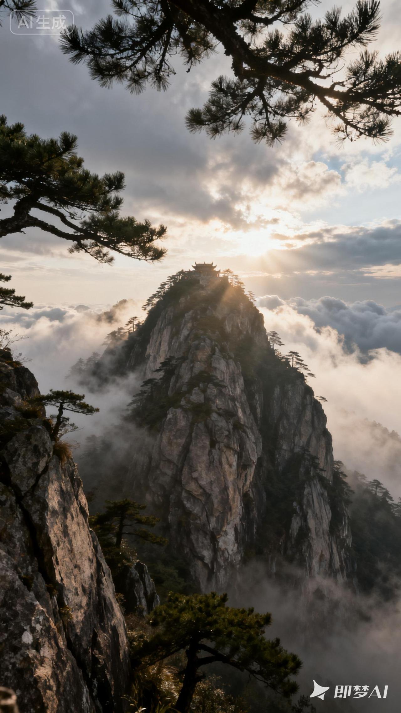 云海翻涌间,奇峰迎晨光,苍松倚壁而立,光影勾勒出山石的雄奇,尽览自然之壮美