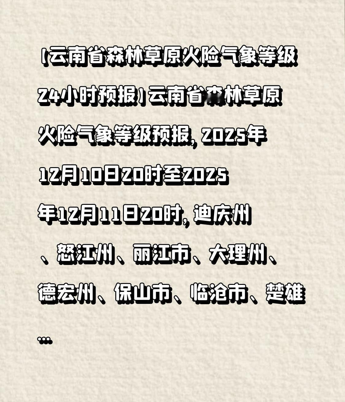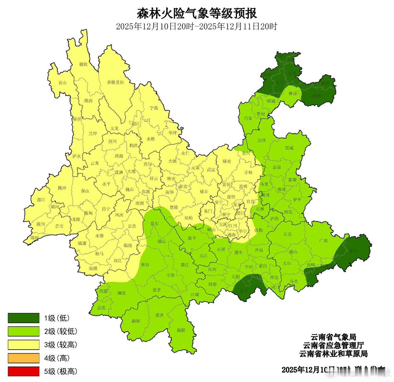 云南森林草原火险情况值得关注。 2025年12月10日20时至11日20时,迪庆