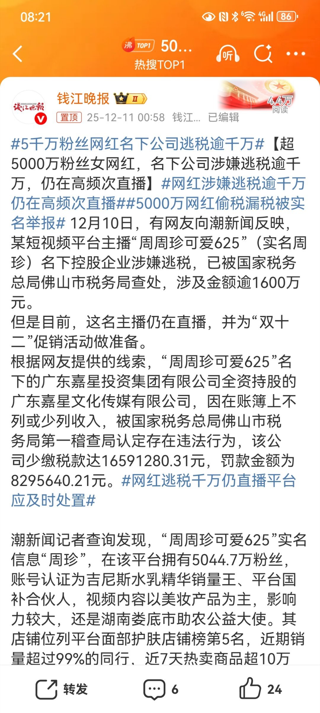 网红涉嫌逃税逾千万仍在高频次直播5千万粉丝网红名下公司逃税逾千万【超5000万粉丝女网红,名下公司涉嫌逃税逾千万,仍在高频次直播】5000万网红偷税漏税被实名举报 5000万粉丝网红偷税1600万,罚款800万,却还能继续直播捞金?税务部门查了,罚了,但平台装瞎,主播照播,粉丝照买——违法成本低到令人发笑!一边顶着“公益大使”光环,一边偷税漏税,脸皮比带货滤镜还厚。平台若继续纵容,就是在告诉全网:只要流量够大,法律就是摆设!该封号封号,该补税补税,别让“网红特权”践踏公平底线!网红逃税千万仍直播平台应及时处置