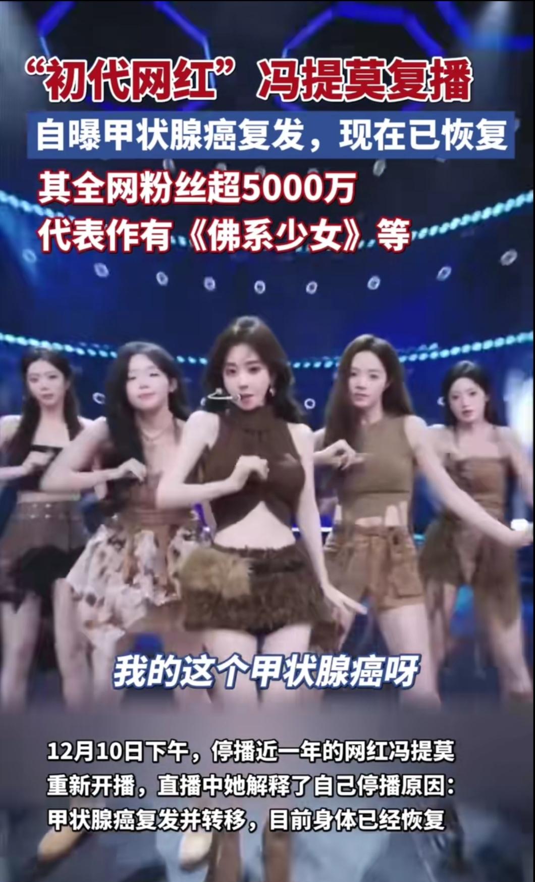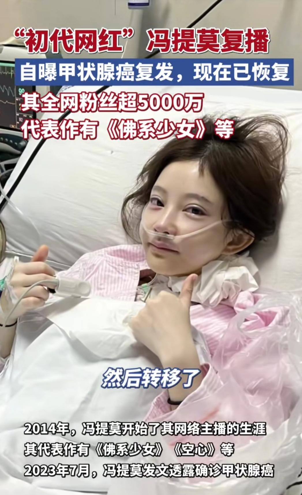 谁能想到,那个唱着《佛系少女》火遍全网的冯提莫,消失半年竟是在和癌症掰手腕?12月10日复播时,她云淡风轻说“甲状腺癌复发过”,却藏不住眼底的疲惫。 曾经以为网红的光鲜都是理所当然,直到看到她带着疤痕坚持,才懂成年人的从容全是伪装。4000万粉丝见证的不只是她的歌声,更是一个普通人在聚光灯下的坚韧——生病时没人替她扛,康复期的痛苦没人替她受,却还要笑着说“我没事”。 我们总羡慕别人的光芒,却忘了每个看起来轻松的人,都在背后熬过无数个难眠的夜。生活从不会手下留情,但那些咬牙坚持的日子,终将成为照亮前路的光。愿我们都能对自己温柔点,也对身边人多份体谅,毕竟谁都在努力活着。