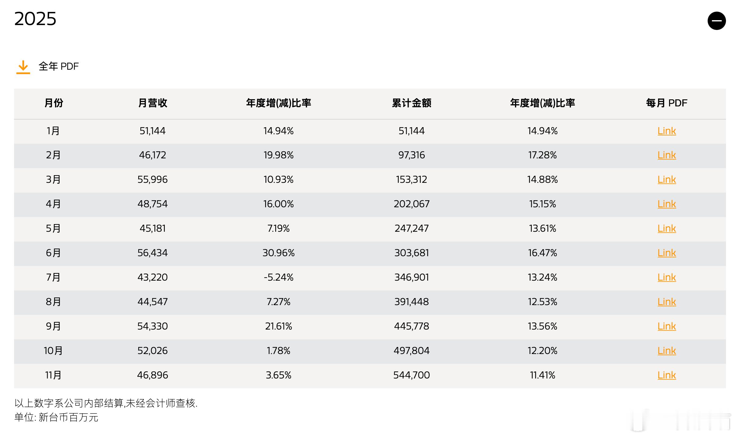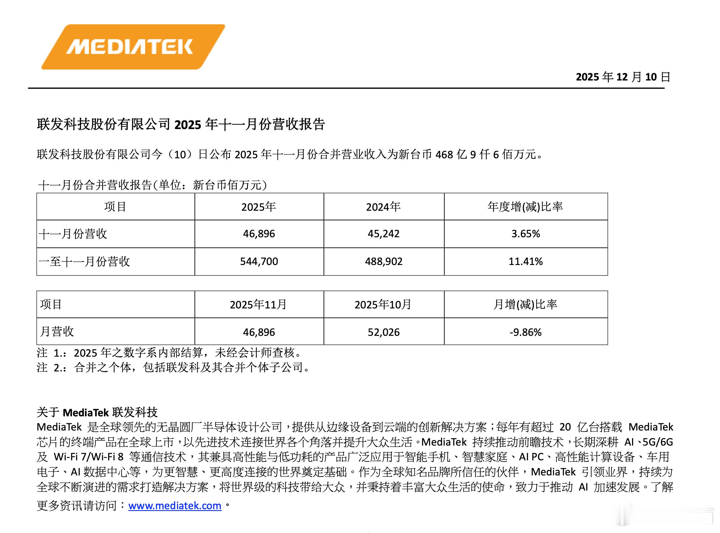 联发科 2025 年前 11 个月营收 5447 亿元新台币(约合 1234.83 亿元人民币),同比增长 11.41%每天收入约3.7亿,注意,不是净利润