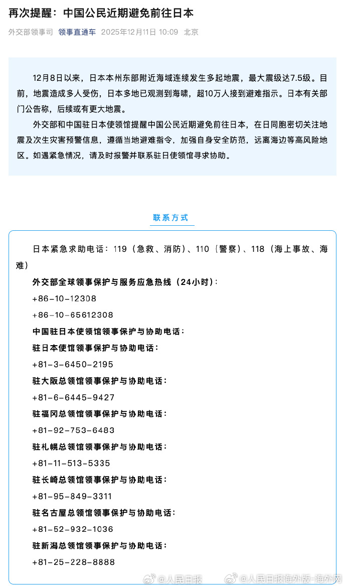【注意!#外交部发提醒近期避免前往日本#】#再次提醒近期避免前往日本# 12月8日以来,日本本州东部附近海域连续发生多起地震,最大震级达7.5级。目前,地震造成多人受伤,日本多地已观测到海啸,超10万人接到避难指示。日本有关部门公告称,后续或有更大地震。外交部和中国驻日本使领馆提醒中国公民近期避免前往日本,在日同胞密切关注地震及次生灾害预警信息,遵循当地避难指令,加强自身安全防范,远离海边等高风险地区。如遇紧急情况,请及时报警并联系驻日使领馆寻求协助。联系方式日本紧急求助电话:119(急救、消防)、110(警察)、118(海上事故、海难)外交部全球领事保护与服务应急热线(24小时):+86-10-12308+86-10-65612308中国驻日本使领馆领事保护与协助电话:驻日本使馆领事保护与协助电话:+81-3-6450-2195驻大阪总领馆领事保护与协助电话:+81-6-6445-9427驻福冈总领馆领事保护与协助电话:+81-92-753-6483驻札幌总领馆领事保护与协助电话:+81-11-513-5335驻长崎总领馆领事保护与协助电话:+81-95-849-3311驻名古屋总领馆领事保护与协助电话:+81-52-932-1036驻新潟总领馆领事保护与协助电话:+81-25-228-8888