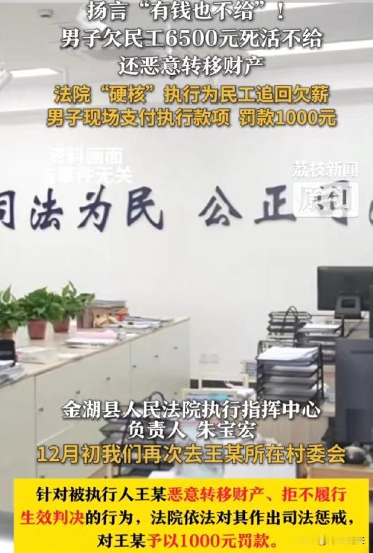 江苏淮安,男子王某找民工葛某安装水电,谈好6500元价格,约定好了结账日期,水电工程完工验收合格后,到了约定结账的时间,王某却翻脸不给钱,还称没钱,葛某多次索要无果,无奈起诉了王某。法院判决王某限期支付,王某不仅不支付,还恶意转移财产,法院发现后采取措施,王某这下慌了。 据荔枝新闻报道,王某家里需要安装水电,对比价格后,觉得报价都太高,经打听他找到价格合理的葛某。 两人查看老宅后,葛某报6500元,王某爽快答应,承诺2025年4月10日前结清。 葛某接活后,扛着工具赶到王某家,找了工人开始赶工,半个多月后,水电工程终于完工。 王某来验收时,这看那摸,脸上也露出很满意的笑,称赞葛某这活干得挺扎实,到时我付钱。 可到了4月10日,葛某给王某打电话,电话那头王某却说现在没钱,让葛某再等等。 葛某说咱当初可是说好了的,今天必须给钱。 王某却不耐烦地说,催什么催,我说没钱就是没钱,又不是不给你,宽限一段时间。 葛某连续几天给王某打电话,王某不是不接电话,就是接起来没说两句就挂断。 葛某实在没办法,只好跑到王某家去要钱。 到了王某家,葛某敲了半天门,王某才打开门。 葛某刚开口说要钱,王某就翻脸了,你少在这纠缠我,我说没钱就没钱,有本事你去告我。 葛某没想到王某会耍无赖,他说:好,那我就去告你,我看能不能治得了你。 葛某回家后,收集好了相关证据,提起了诉讼。 这时的王某却狡辩,他说葛某干的活质量有问题,不应该给这么多钱。 葛某一听就火了,说你这纯属胡说八道,工程完工时你验收合格了,现在又来说质量问题,这不是耍无赖吗。 根据《民法典》第577条规定,当事人一方不履行合同义务或者履行合同义务不符合约定的,应当承担继续履行、采取补救措施或者赔偿损失等违约责任。 王某和葛某之间虽然没有签订书面合同,但双方已经就水电安装的价格、付款时间等事项达成了口头约定,这种口头约定同样具有法律效力。 葛某按照约定完成了水电安装工程,王某就应该按照约定支付工程款。 王某拒绝支付的行为,已经构成了违约,应当承担继续履行的责任。 法院审理认为: 葛某已经按照约定完成了水电安装工程,王某应该按照约定支付6500元工程款。 于是,最终法院判决:王某在限期内支付葛某6500元。 王某拿到判决书后,虽然有些害怕,但还是不甘心把钱给葛某,他想出了一个歪主意,偷偷把自己的部分财产转移到了亲戚名下,以为这样就拿他没办法了。 葛某在等王某付工程款的日子,一直留意着王某的动静,他发现王某最近有些反常,好像是在故意躲着他。 葛某觉得事情不对劲,就向法院反映了情况。 法院接到葛某的反映,经过一番调查取证,发现王某确实存在恶意转移财产的行为。 法院再次传唤王某,王某一开始还嘴硬,不承认自己转移了财产。 最终,王某得知已经掌握了他的充分证据,证明他存在恶意转移财产,该行为是妨碍执行的行为,是要受到法律制裁的。 王某立刻认怂,连忙求饶说自己错了,愿意马上支付工程款。 从法律层面分析: 根据《民法典》第469条规定,当事人订立合同,可以采用书面形式、口头形式或者其他形式。 王某和葛某虽然只是口头约定,但这种约定同样具有法律效力。 葛某按照约定完成了水电安装工程,王某就应该履行支付工程款的义务。 而王某在法院判决后,恶意转移财产,妨碍法院执行,这种行为违反了《民事诉讼法》第111条的规定,诉讼参与人或者其他人有隐藏、转移、变卖、毁损已被查封、扣押的财产,或者已被清点并责令其保管的财产,转移已被冻结的财产等行为的,可以根据情节轻重予以罚款、拘留;构成犯罪的,依法追究刑事责任。 法院认为: 现在王某知道错了,也已经晚了。 告知王某,现在不仅要全额支付葛某的6500元工程款,还要因为妨碍执行行为缴纳1000元的罚款。 王某听了,后悔得直拍大腿,说自己是一时糊涂,为了这点钱,把自己搞成这样,真是贪小失大。 葛某辛苦干了半个多月的活,王某却耍赖不给钱,还恶语相向,这种行为实在让人气愤。 人与人之间交往,最重要的就是诚信。 王某和葛某既然达成了口头约定,就应该遵守承诺,按时支付工程款。 王某恶意赖账、转移财产的行为,违背了基本的道德准则。 诚信是做人的根本,法律是不可触碰的底线,任何失信耍赖的行为最终都将自食恶果。