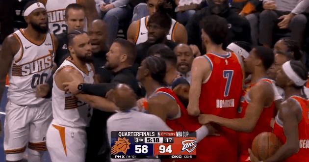 输急眼了!阿伦老毛病又犯了! 在今天NBA季中锦标赛雷霆对阵太阳的第三节比赛中,格雷森-阿伦防守时突然发力推倒霍姆格伦,随后双方引发激烈冲突! 最终裁判给了阿伦二级恶意犯规直接驱逐出场!在球队输30多分的情况下,今天阿伦终是原形毕露,再次下起了狠手!