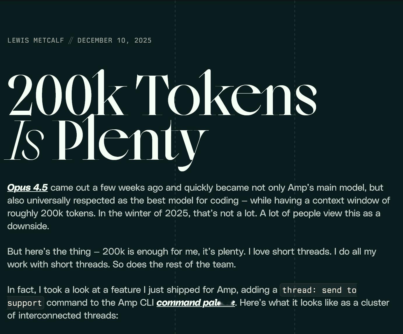 200k 的上下文窗口就足够了~ampcode.com/200k-tokens-is-plenty本文作者 Lewis Metcalf 认为,尽管 Opus 4.5 模型约 200k 的上下文窗口在当下看来不大,但对于编程工作而言完全足够。关键在于采用“短线程”的工作方式,而不是将所有任务堆积在一个超长的线程中。将复杂任务分解为一系列独立、专注的小任务是高效工作的基本原则,这在 AI 时代同样适用。每个短线程对应一个明确的子任务(如:调研、基础实现、重构、代码审查),使得整个工作流程清晰、易于追踪和管理。科技先锋官